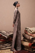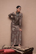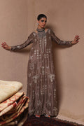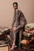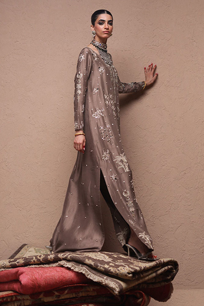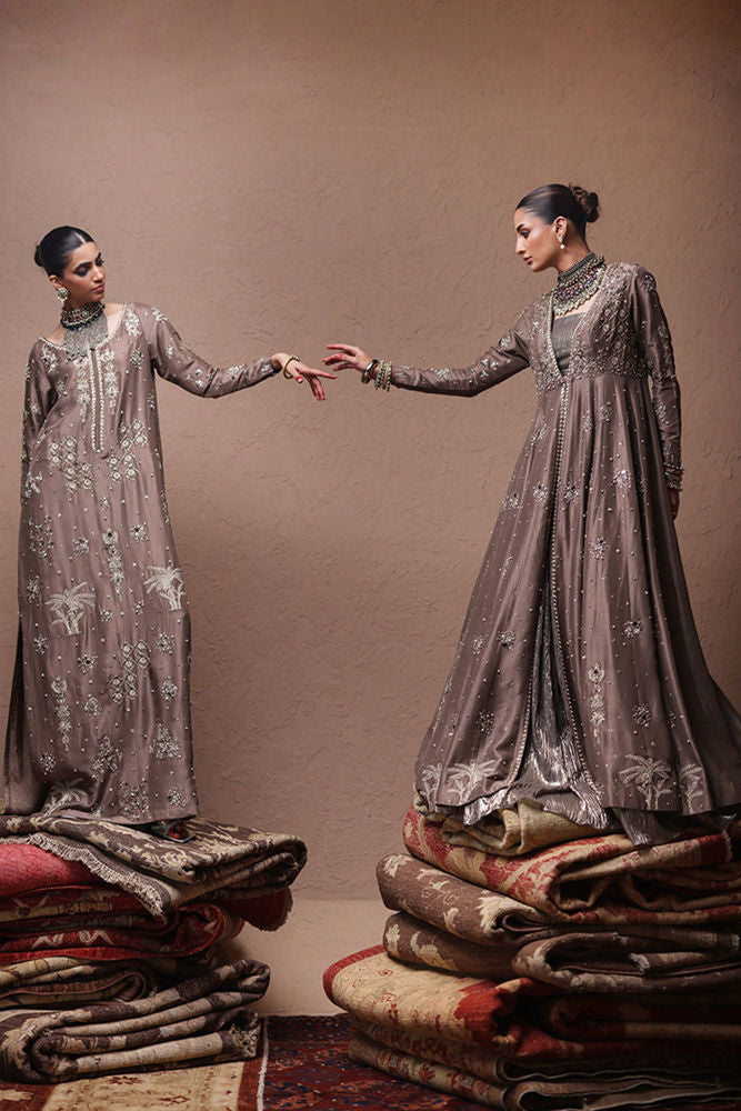 The straight kaftan with slits in Rockridge color is crafted from pure 80gms raw silk and adorned with gold and antique zari embroidery, enhanced by intricate zardozi work featuring kora, dabka, cutdana, stones, pearls, nakshi, sequins, and mirrors on the front, sleeves, and back. It comes with versatile bottom options, including pants in pure raw silk or cotton charmeuse, and culottes in either fabric. The look is completed with a pure medium silk dupatta detailed with all-over botis and chan, beautifully accented with pearls, mirrors, and stones.