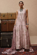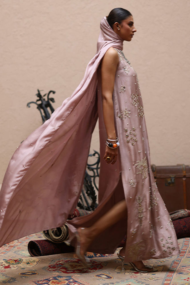 The straight kaftan with slits in Misty Rose color is crafted from pure 80gms raw silk and embellished with gold and antique zari embroidery, enriched with zardozi work featuring kora, dabka, cutdana, stones, pearls, nakshi, sequins, and mirrors on the front, sleeves, and back.It comes with versatile bottom options, including pants in pure raw silk or cotton charmeuse, and culottes in either fabric. The look is completed with a pure medium silk dupatta detailed with all-over botis and chan, delicately accented with pearls, mirrors, and stones.