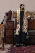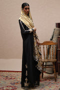 The straight long shirt in black, crafted from pure 80gms raw silk, is adorned with silver and gold zari embroidery and enriched with heavy zardozi work featuring kora, dabka, cutdana, stones, pearls, nakshi and sequins along the back and sleeves. It is paired with cotton charmeuse culottes detailed with silver and gold zari embroidery, zardozi work and a rich banarsi border for a touch of tradition, while a lame shawl in Rich Gold completes the look with exquisite silver and black zari embroidery and heavy zardozi accents, creating a truly regal finish.