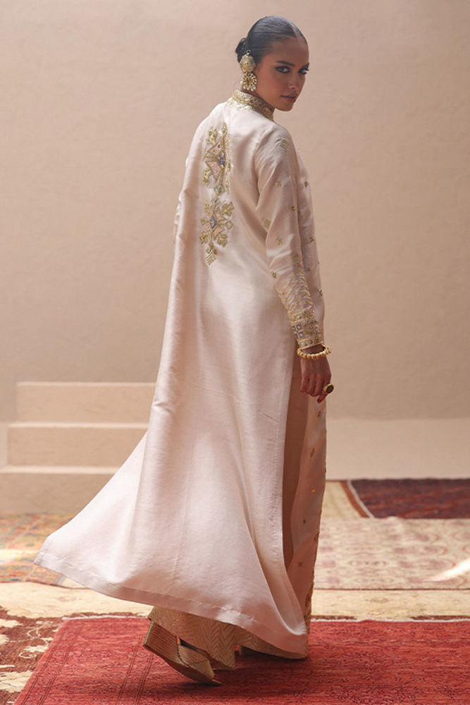 The Seed Pearls jacket, crafted from pure 80gms raw silk, is beautifully embellished with gold gota work, zari embroidery, and colored appliqué. Intricate zardozi work with kora, dabka, cutdana, stones, pearls, nakshi, and sequins enhances the front and sleeves, giving the design a regal touch. It is styled with a sleeveless inner in cotton charmeuse for effortless layering. The look is completed with cotton charmeuse culottes, finished with a traditional gota border that adds a graceful edge.