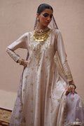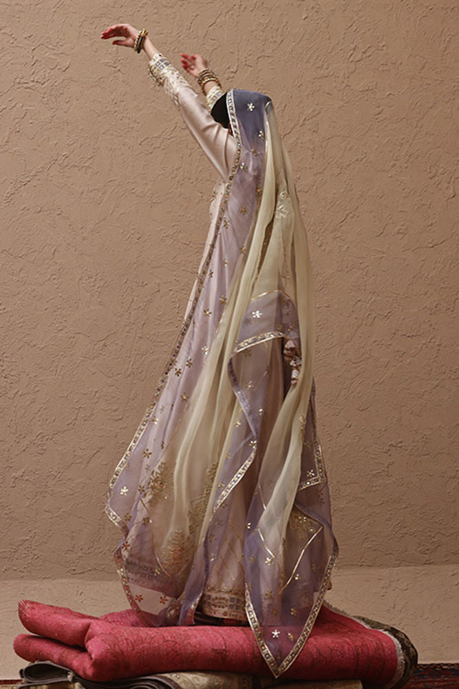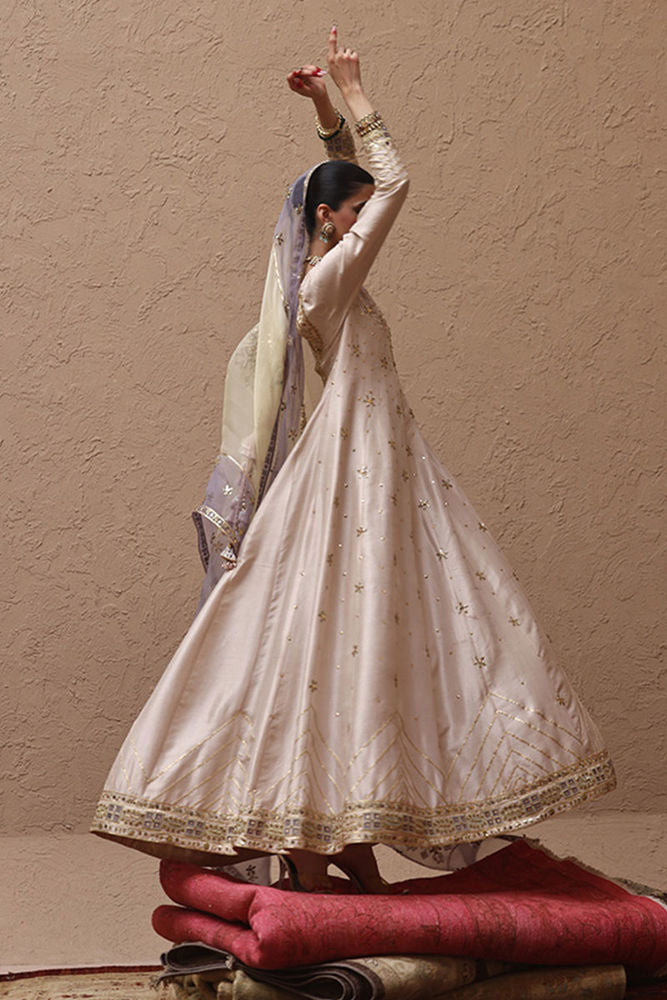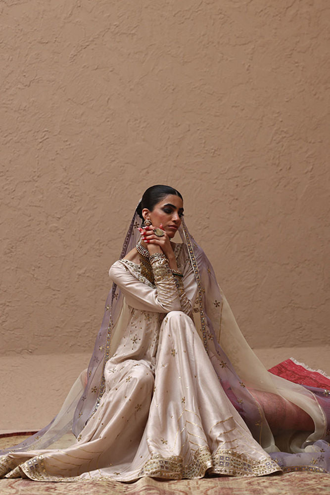 The kalidaar in Seed Pearls color, crafted from pure 80gms raw silk, is adorned with gold gota work, zari embroidery, and colored appliqué. Exquisite zardozi detailing with kora, dabka, cutdana, stones, pearls, nakshi, and sequins graces the front, sleeves, and back, while handmade tassels add a delicate finishing touch. It is paired with cotton charmeuse pants and completed with a pure organza dupatta featuring a four-sided border and all-over embroidery in gota, zari, and sequins for a timelessly elegant look.