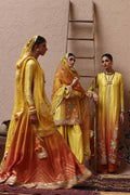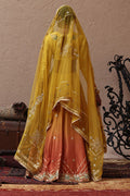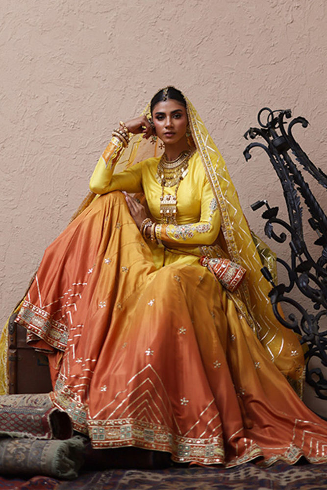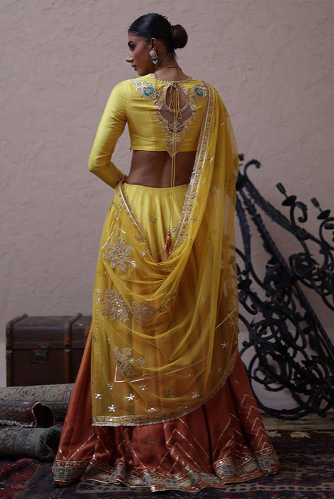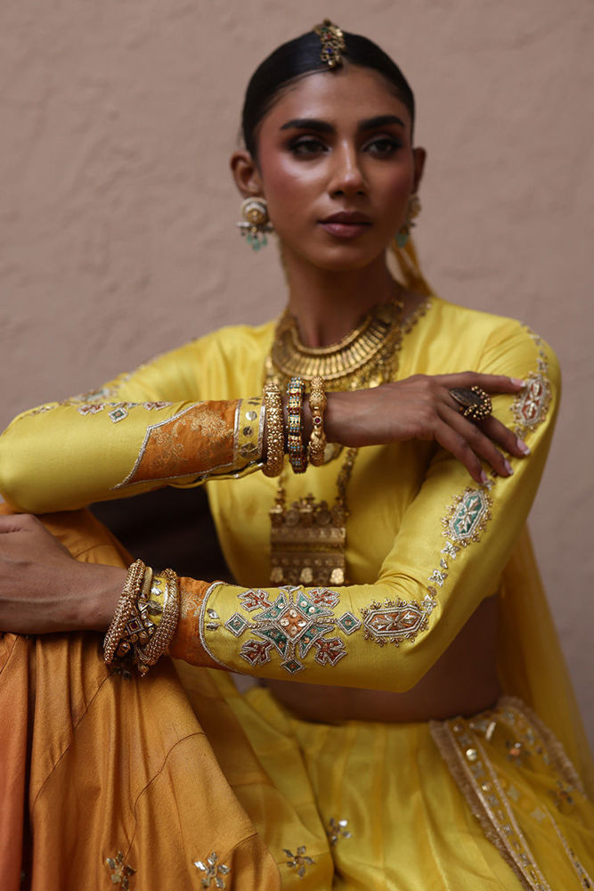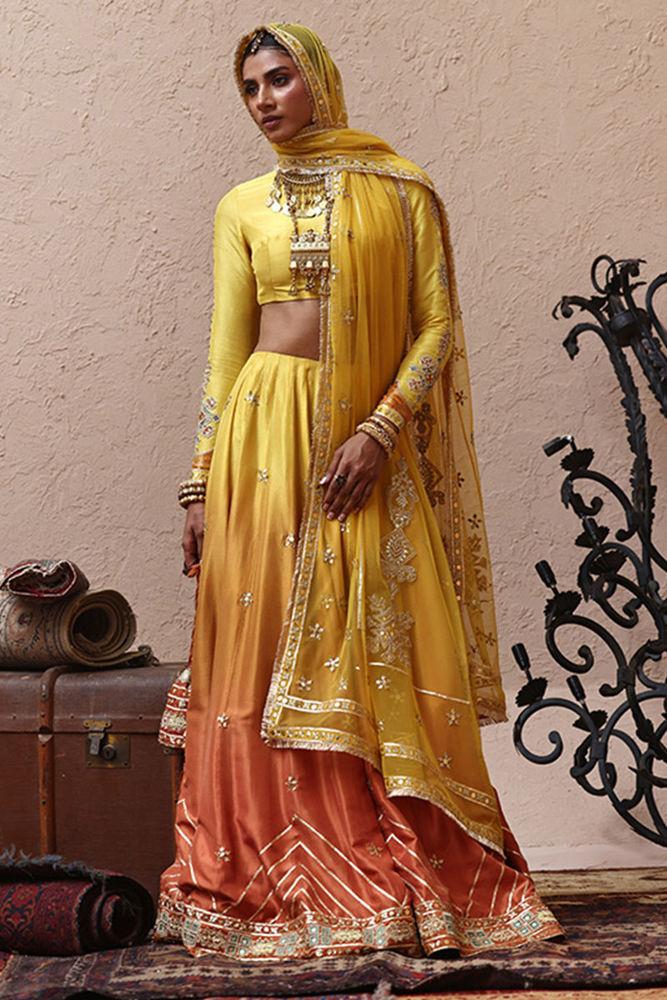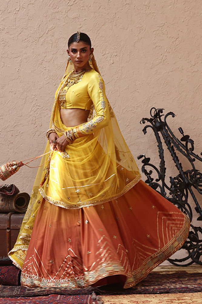 The vibrant yellow blouse in pure 80gms raw silk is adorned with gold gota work, zari embroidery, and colored appliqué, further enhanced with intricate zardozi detailing of kora, dabka, cutdana, stones, pearls, nakshi, and sequins on the front neck, sleeves, and back, finished with handmade tassels. It is paired with a vibrant yellow and orange ombré lehenga in in pure 80gms raw silk, beautifully detailed with colored appliqué borders, gold gota work, zari embroidery, and elaborate zardozi accents. Completing the ensemble are two dupatta options: a net dupatta with a four-sided border and all-over gota, zari, and sequins embroidery, or a pure organza dupatta with a four-sided embroidered border and delicate all-over botis, offering versatility and grace.