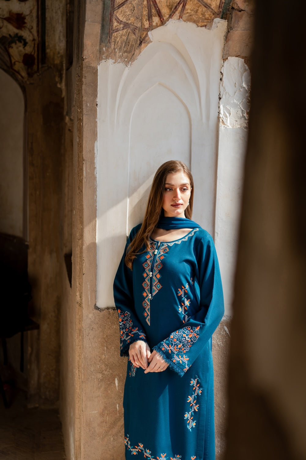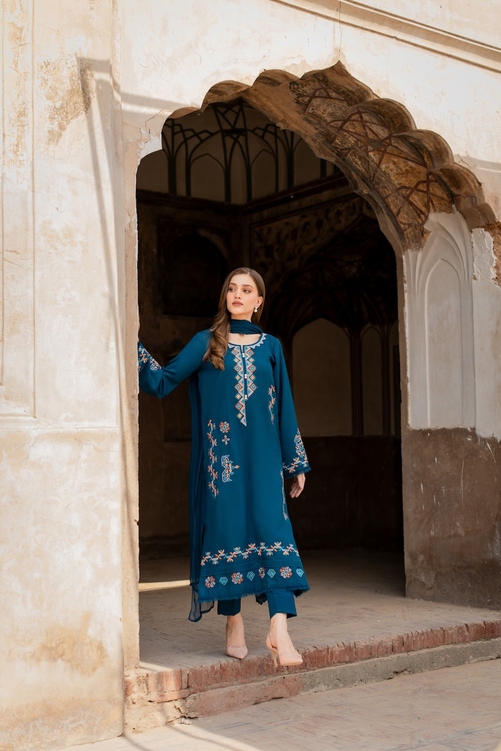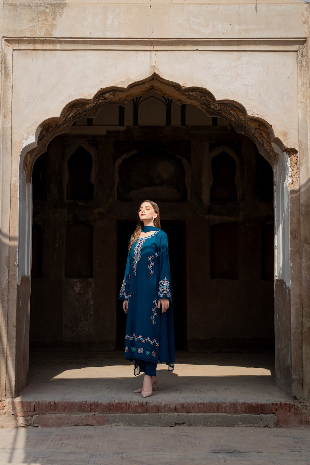 The Lamaya set is a beautifully crafted 2-piece outfit in a rich teal blue shade, adorned with delicate hand embroidery along the front, sleeves, daaman, and neckline. Blending traditional detail with a modern silhouette, this ensemble offers timeless elegance with a contemporary touch. Style it with the separately available chiffon dupatta for a complete, polished look.