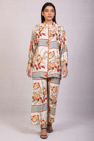 A floral printed two-piece chambray shirt with matching capri pants.