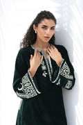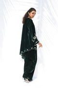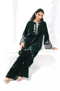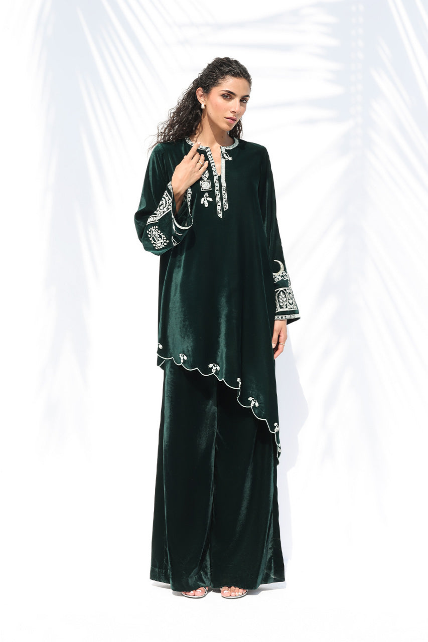 Effortlessly refined, this deep emerald velvet ensemble channels vintage charm. The long kurta features intricate ivory embroidery along the neckline, sleeves, and asymmetrical hem, adding artistry to its rich texture. Paired with straight trousers that drape elegantly, the look captures understated luxury through minimal detailing, plush fabric, and a timeless silhouette.