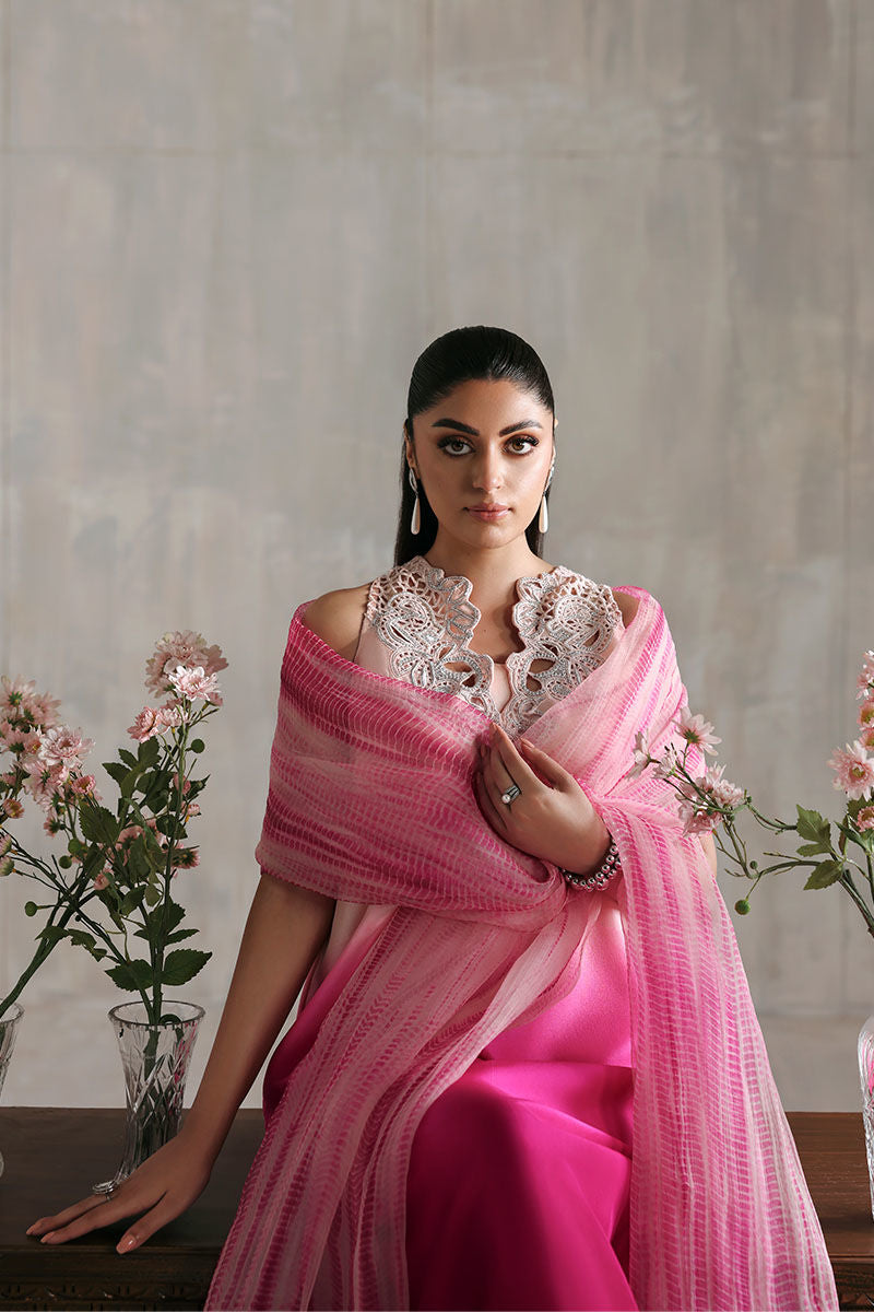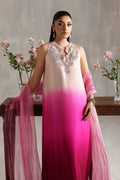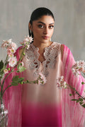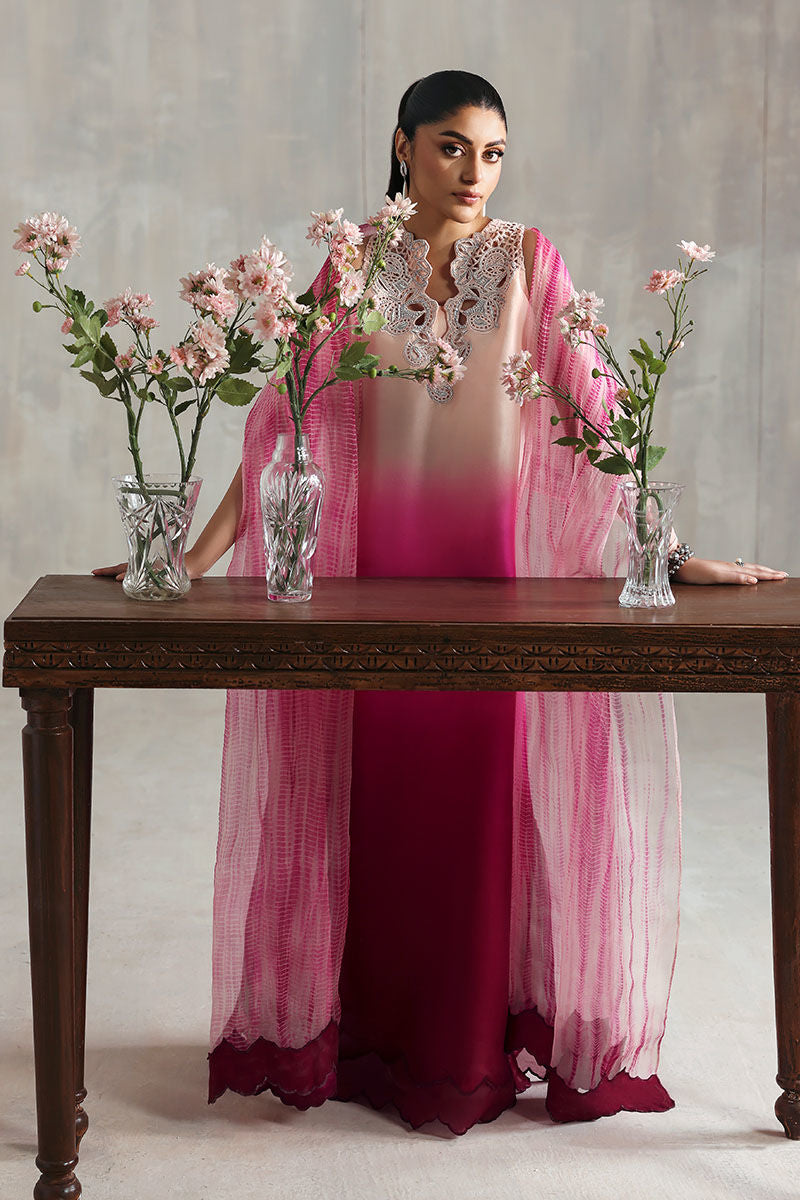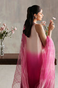 This peach and purple shaded kaftan, made from pure raw silk, exudes elegance and charm. Paired with a soft pure organza dupatta, it creates a refined and graceful look, perfect for any special occasion.