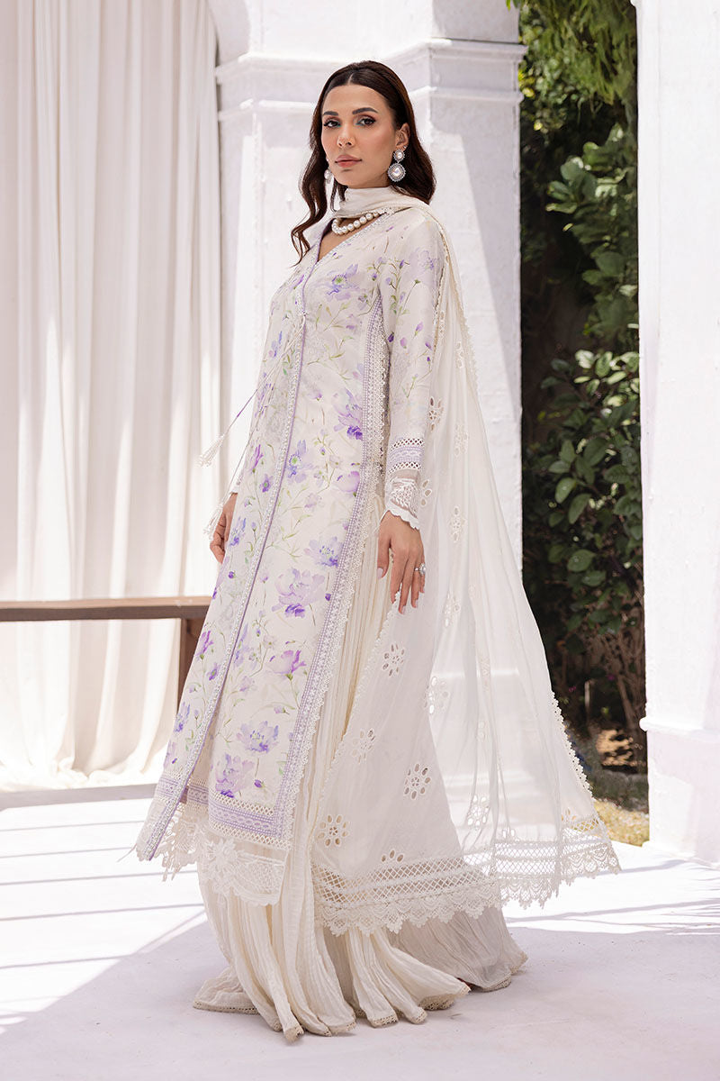 Lilac raw silk shirt in an angarkha style, printed with a soft floral digital pattern. The shirt is adorned with silver handwork along the neckline and borders, with matching laces that enhance the structure of the garment. A silk cutwork dupatta is included, decorated with lace detailing that aligns with the shirt’s design. The ensemble is finished with a silk crushed dhaaka, providing fluidity and ease of movement.