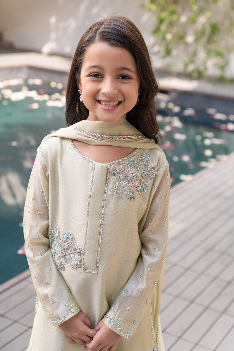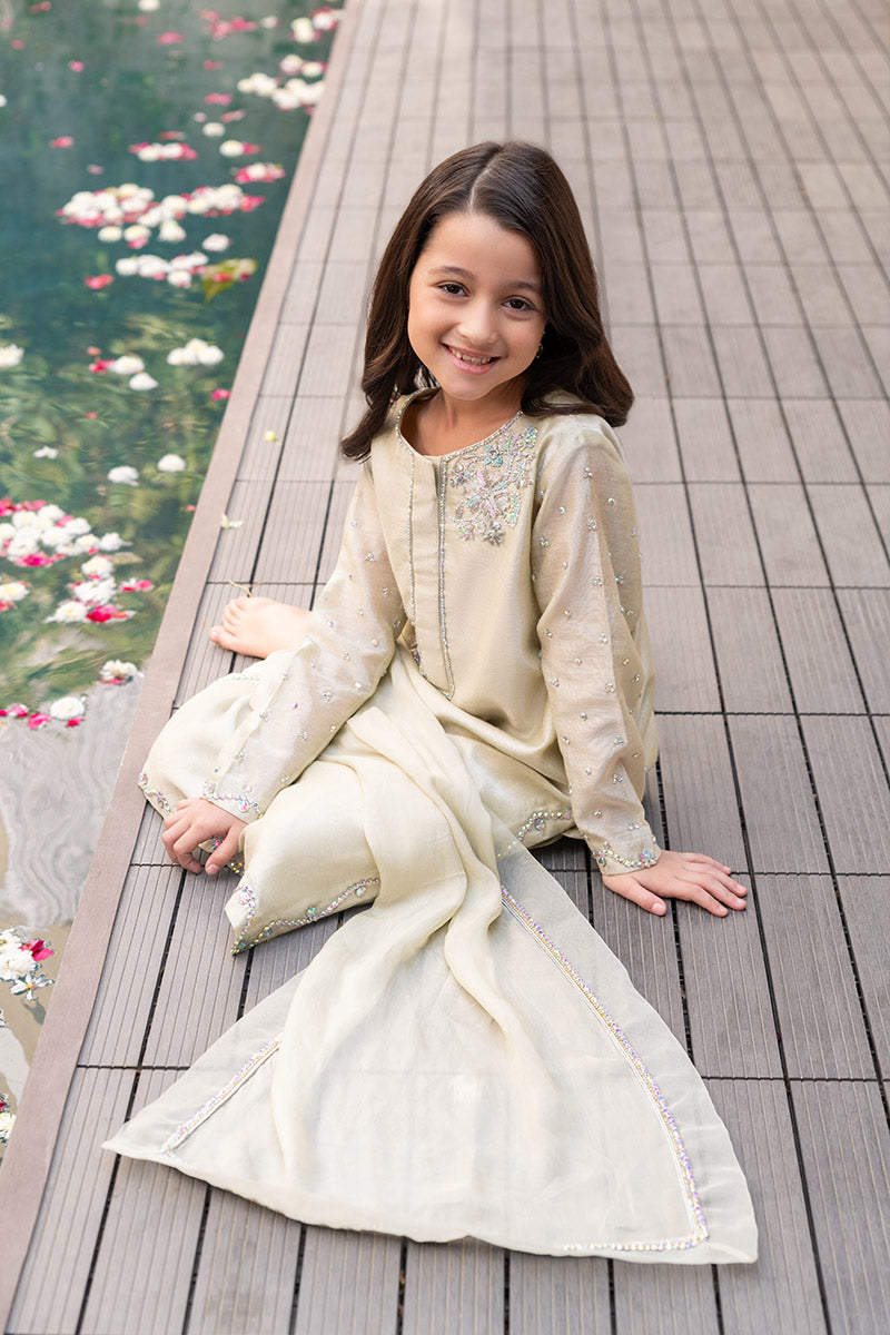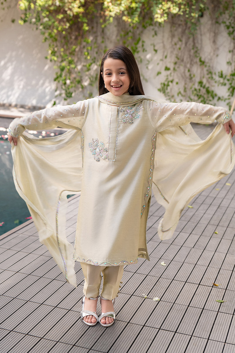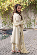 Drenched in the brilliance of lime yellow, Aurora is a celebration of heritage craftsmanship with a modern touch. The Zari Khadi shirt shimmers with a rich texture, perfectly complemented by pure sheesha silk straight pants and a medium silk dupatta adorned with delicate organza borders and sparkling stone details.
