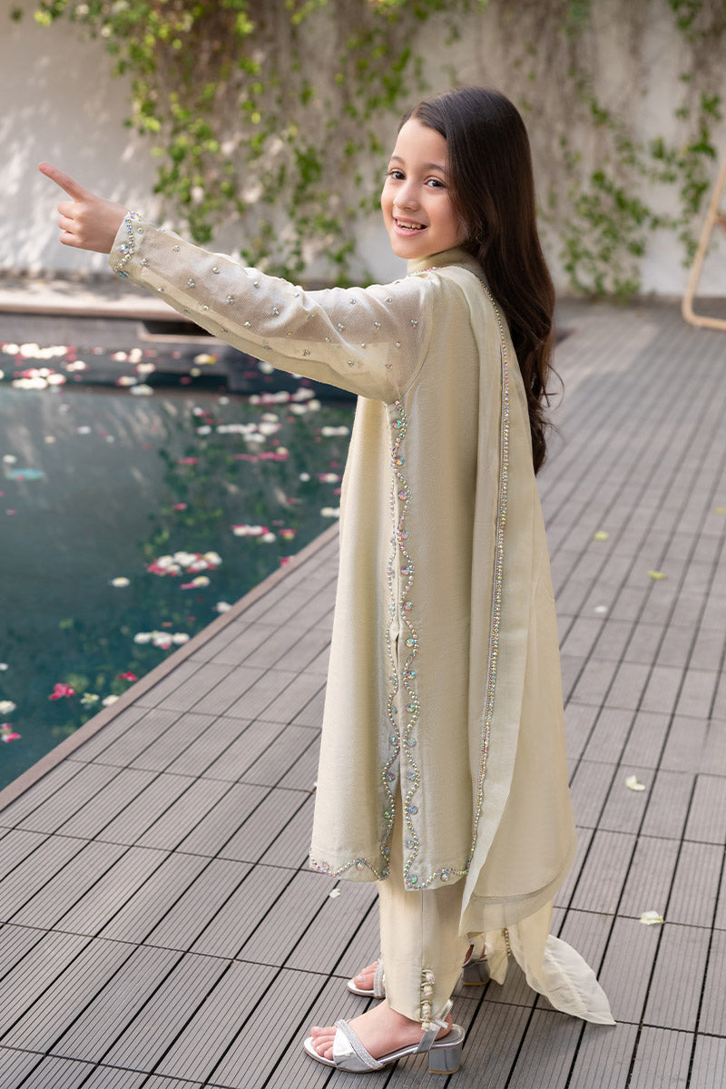 - Embellishments: Naqshi, Dabka, French knots, and shimmering stones on sleeves, neckline, side hems, and back
