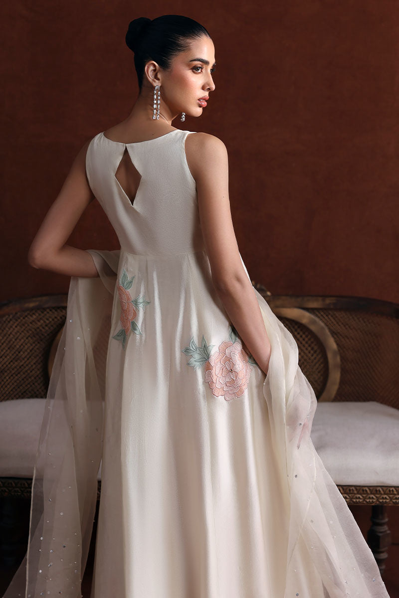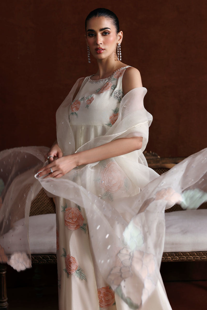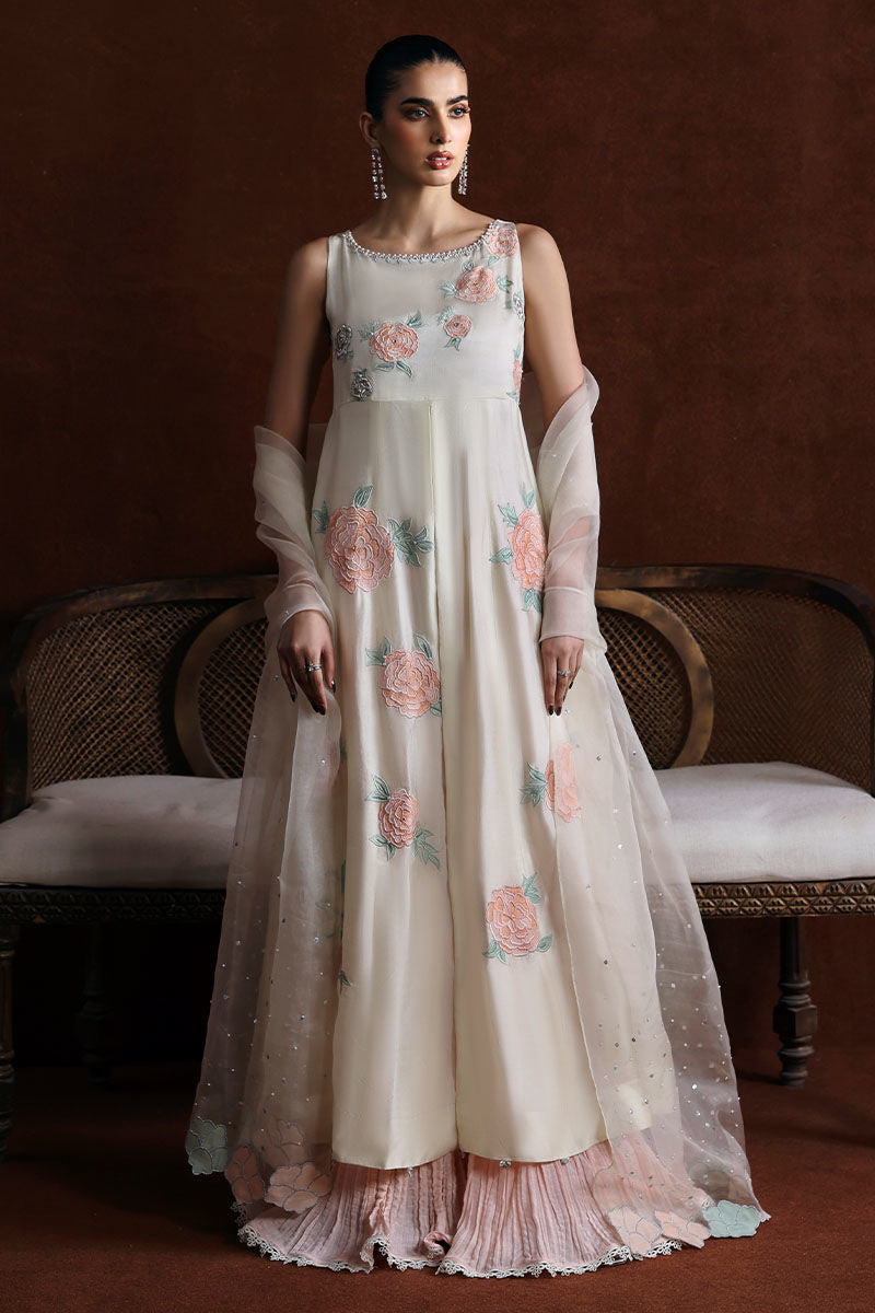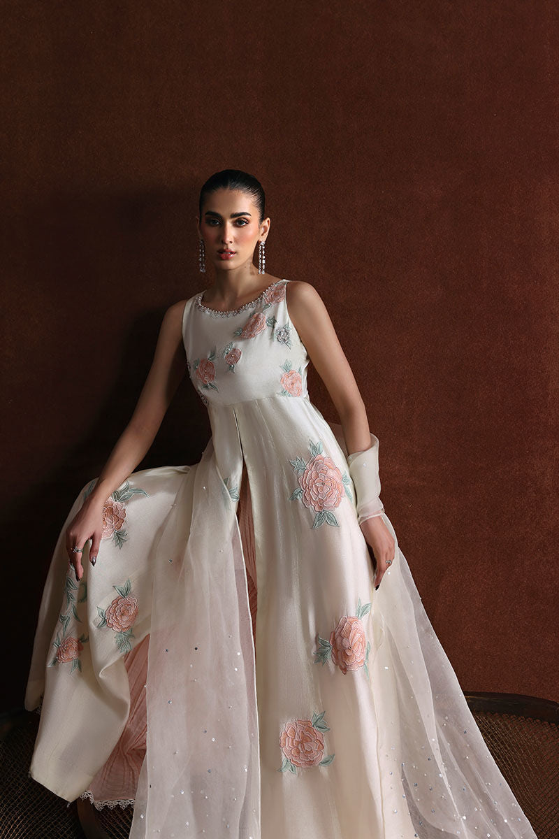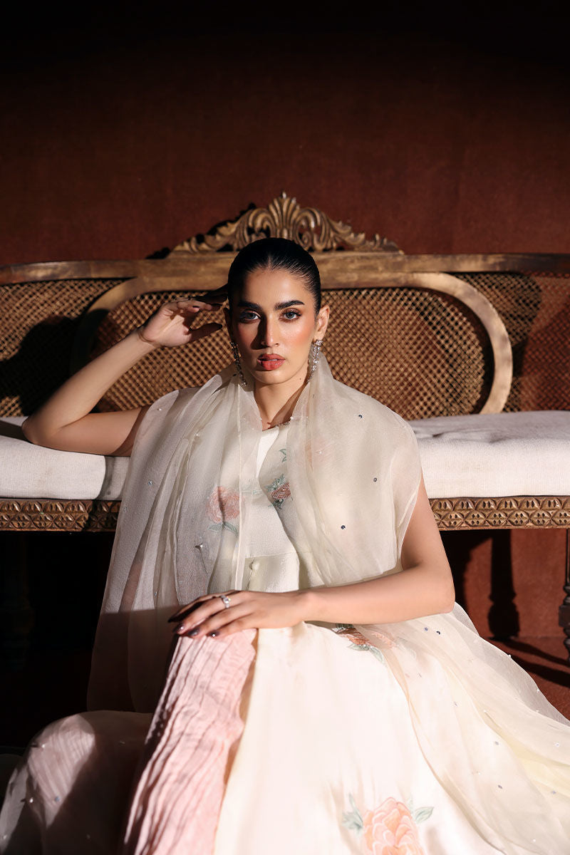 An exquisite ensemble featuring a Shesha silk shirt and PK raw silk sharara, paired with a pure Organza off-white dupatta. A timeless blend of elegance and tradition.