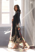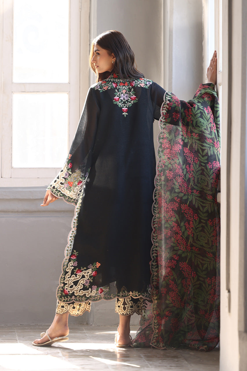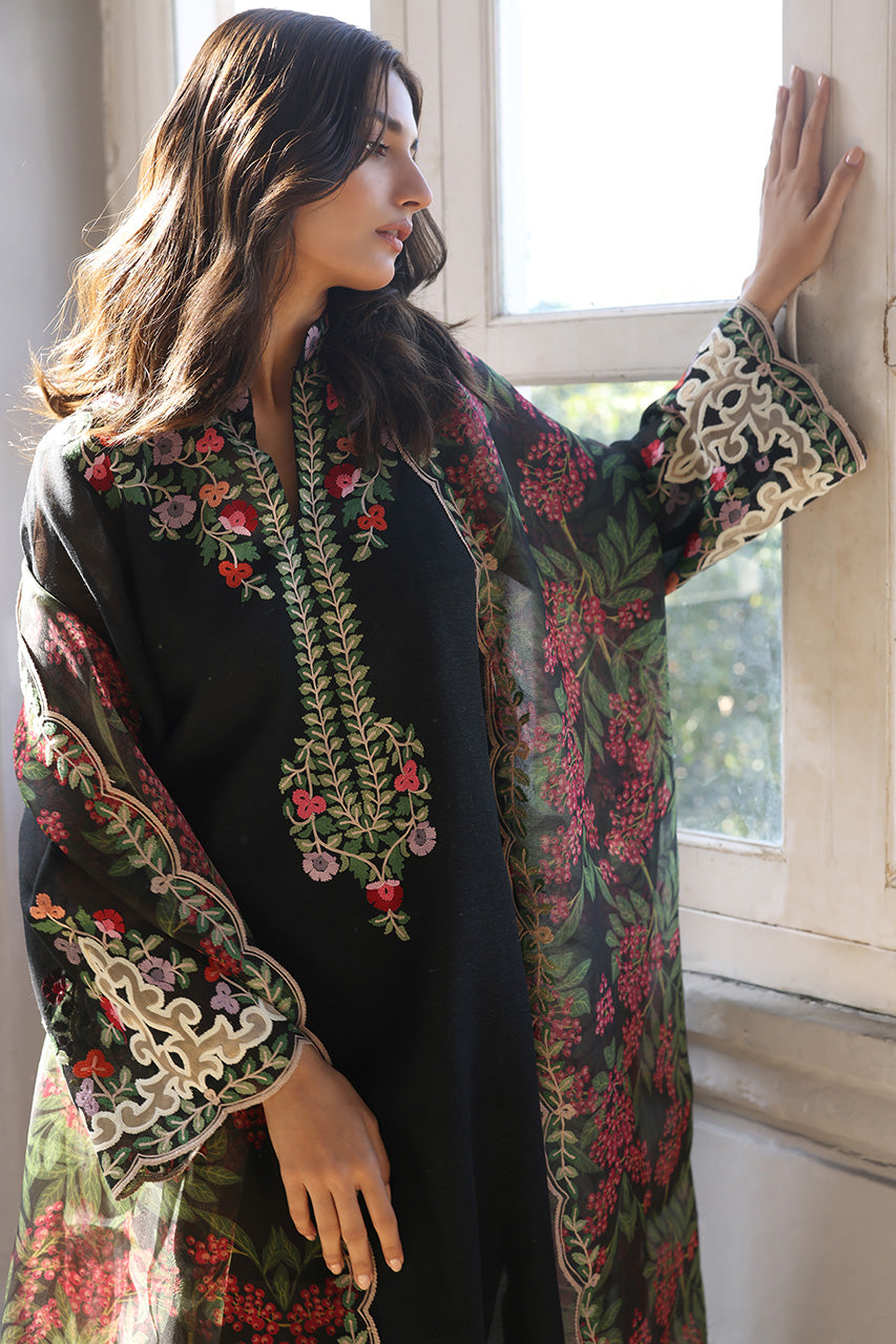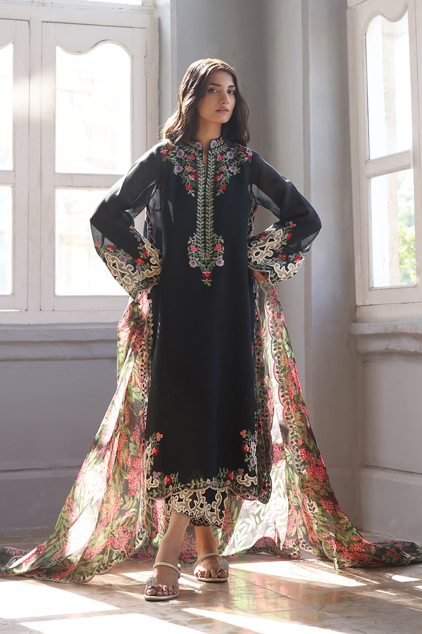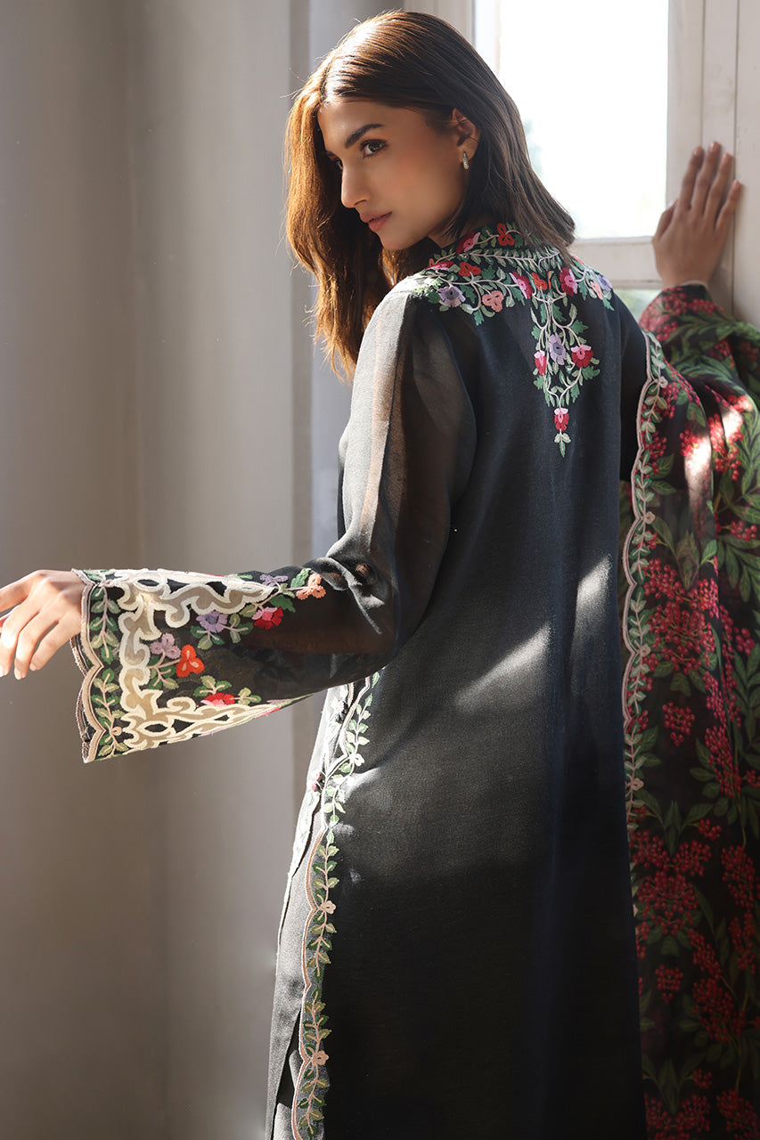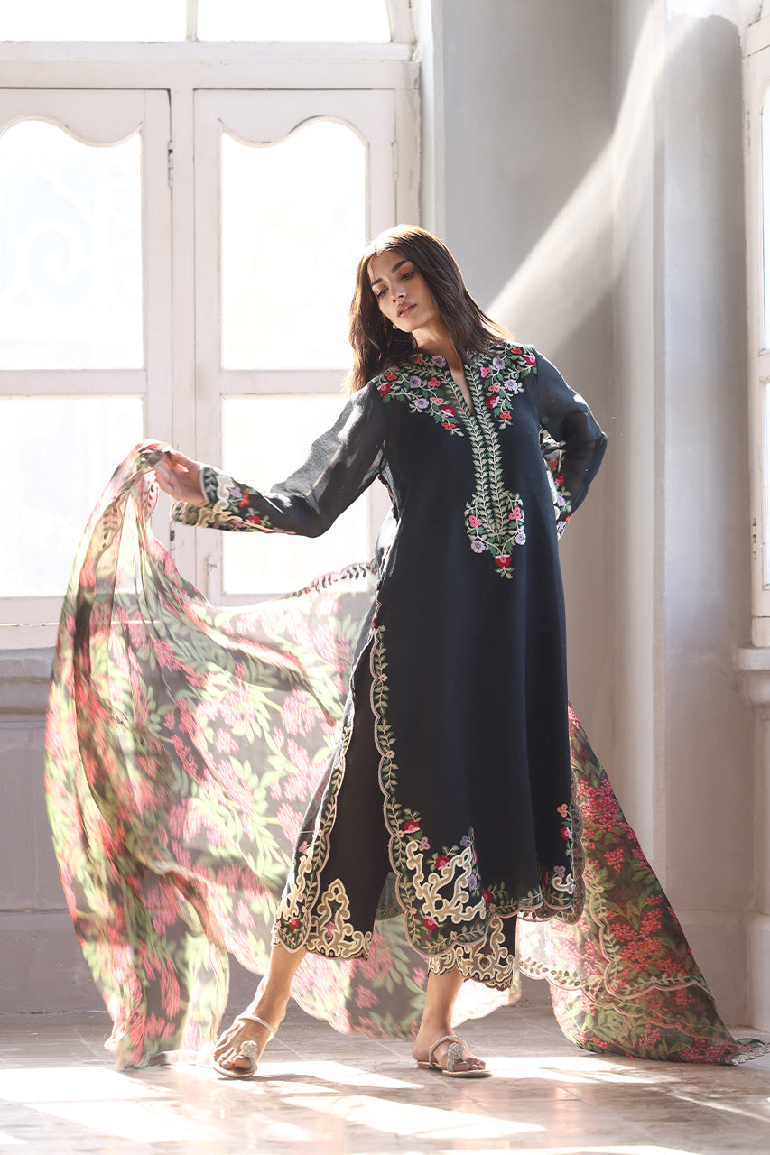 A deep ebony hued shirt, adorned with delicate aari embroidery and artisanal detailing exudes contemporary charm on a khaddi corduroy canvas. Paired with embroidered pure rawsilk culottes and a sheer organza dupatta featuring lush botanical patterns, this ensemble is perfect for a light festive affair.