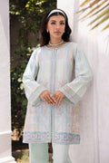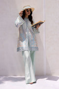 Ice blue front-open jacket with a rounded neckline, detailed with hand-embellished work along the neckline, sleeves, and daman. The sleeves feature organza inserts, adding transparency and lightness to the design. Paired with flared raw silk pants that balance the jacket’s structure, the look combines tailored detail with flowing elements for a contemporary yet timeless finish.