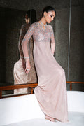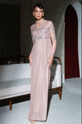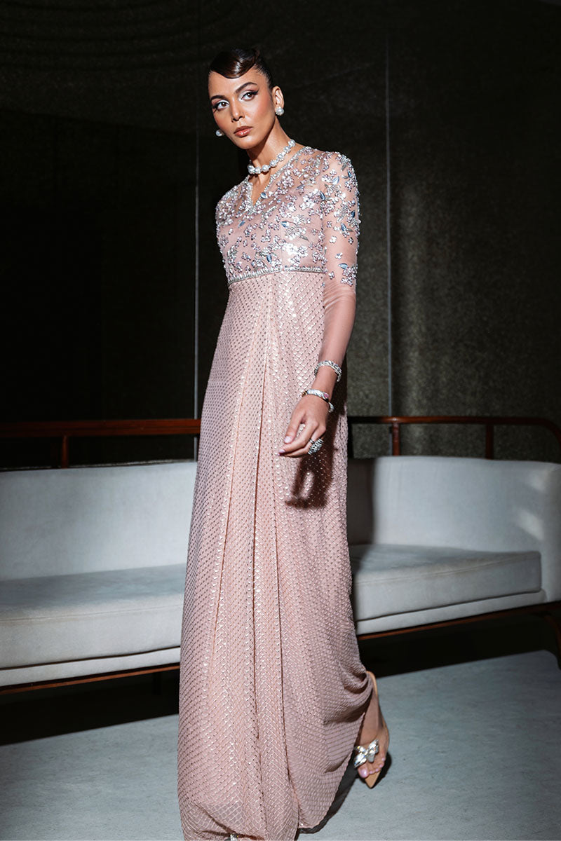 Includes: Dress Madame — where softness meets sophistication. In a graceful shade of dusty pink, this full-length dress features hand-embellished florals on the bodice and sleeves, delicately detailed with sequins, crystals, and beadwork. A subtly adorned chiffon drape adds movement and charm, while a sheer organza dupatta with sequin spray completes the look with ethereal elegance. A timeless silhouette made to enchant.