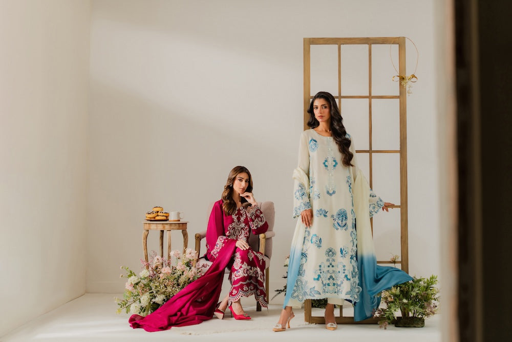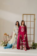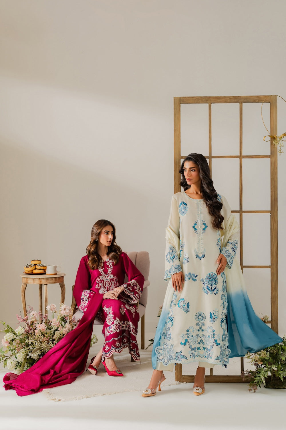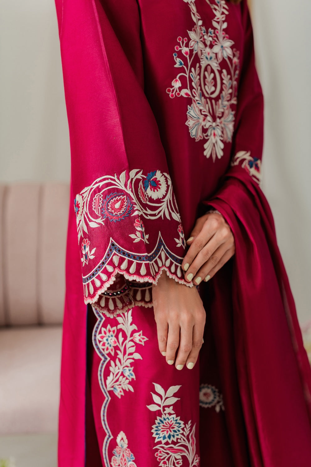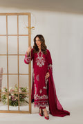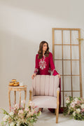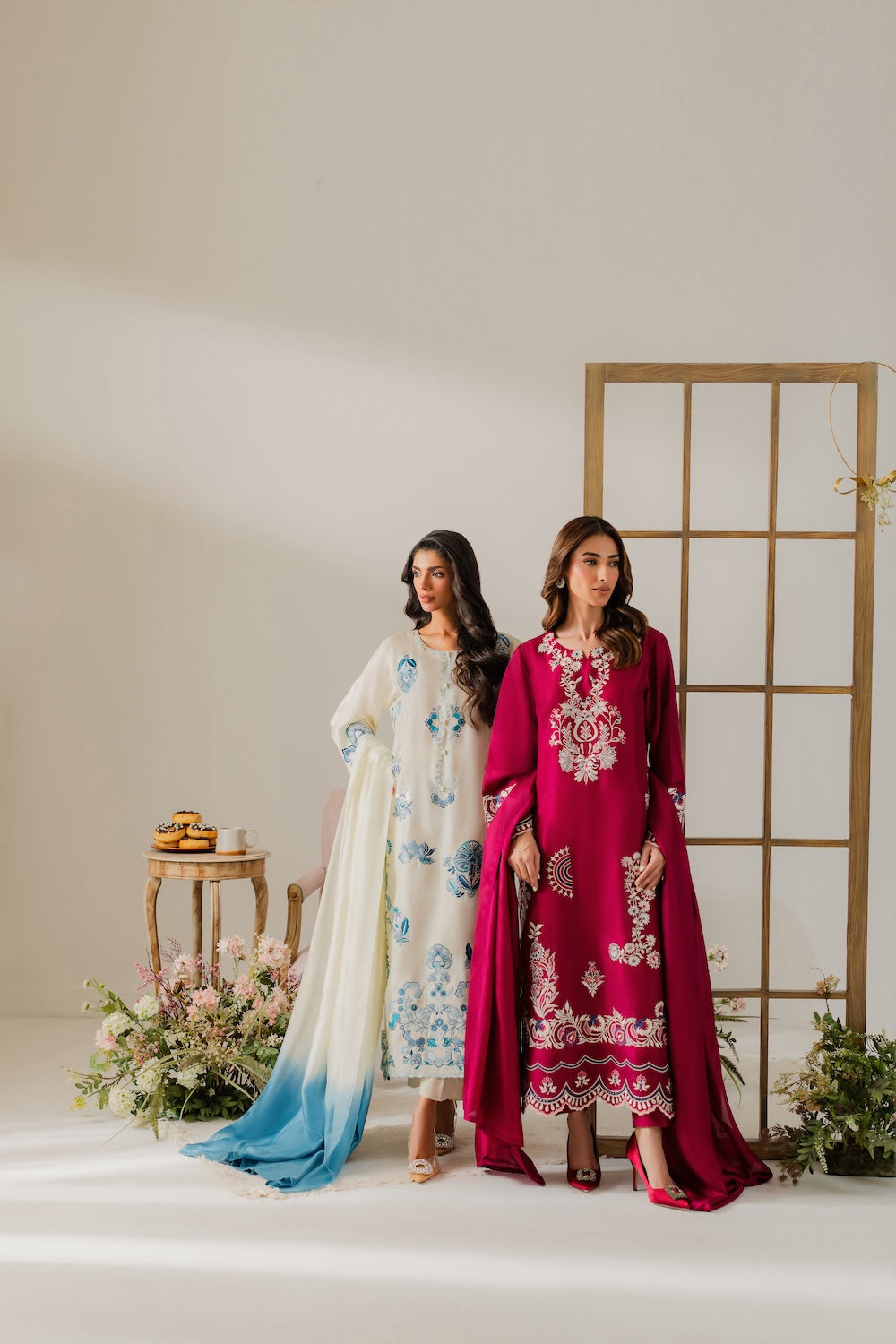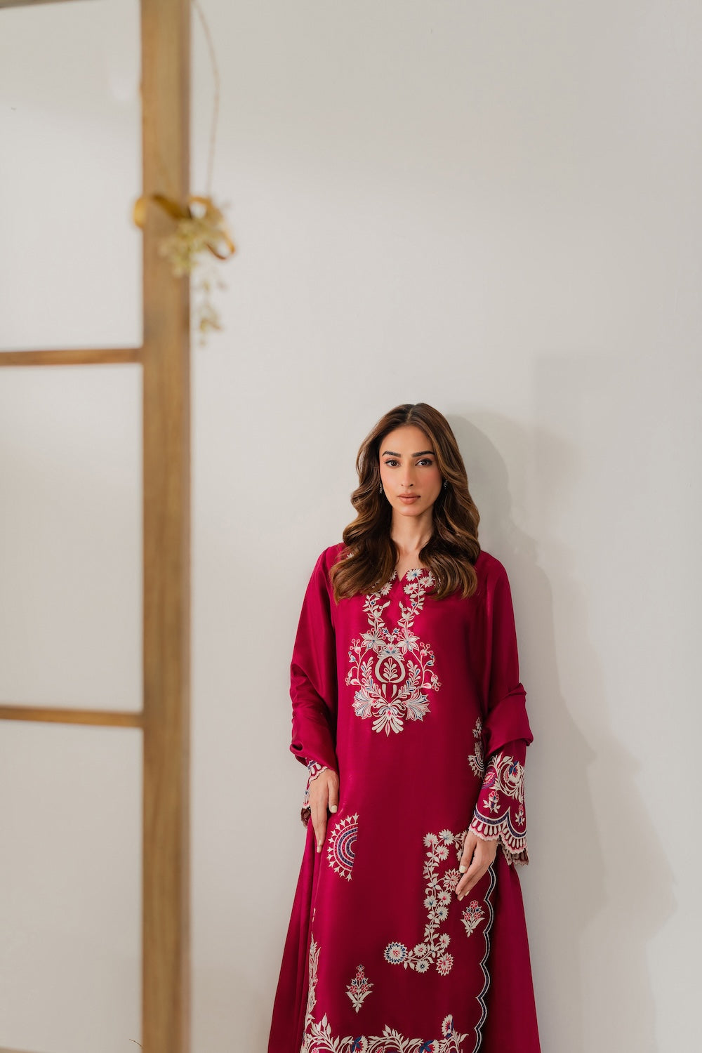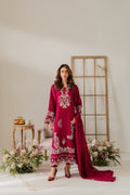 This striking magenta two-piece outfit is crafted from premium Korean silk, offering a luxurious feel and graceful drape. The shirt is adorned with exquisite hand-machine embroidery intricately spread across the entire front, showcasing fine craftsmanship in delicate patterns that add both richness and elegance. The lustrous silk base enhances the embroidery's detail, making the ensemble perfect for festive and formal gatherings. A pure silk dupatta is available separately, designed to complement the outfit with effortless sophistication.