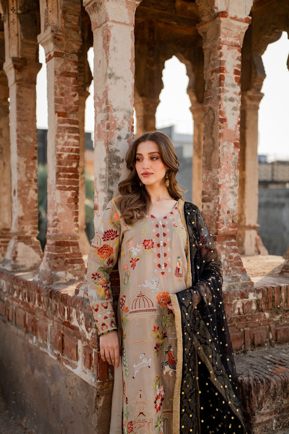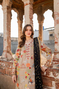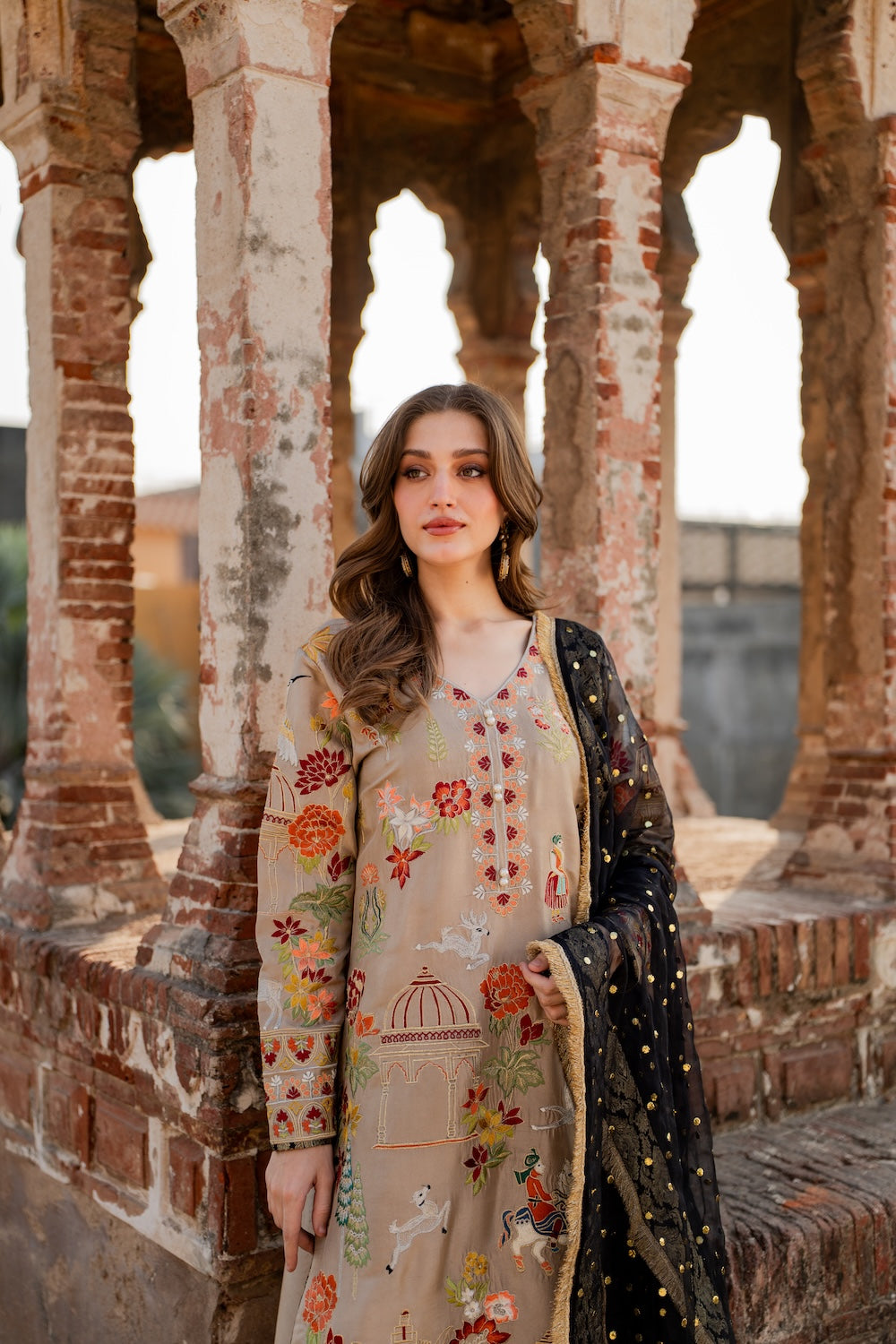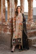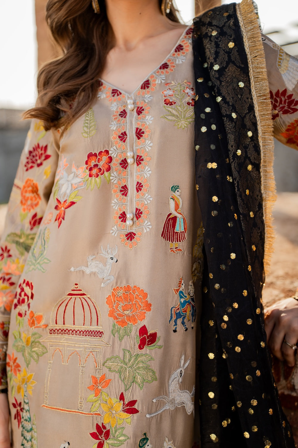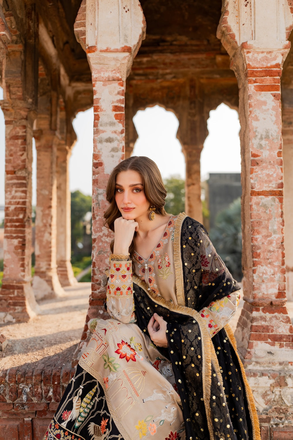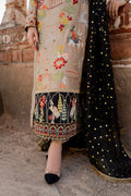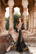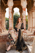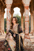 Malika is a masterpiece of embroidered storytelling—intricate birds and arches dance across the fabric, weaving a narrative of elegance. Every stitch deepens the allure, framed by striking black finishing that makes the design pop. Paired with a luxurious mukesh chann dupatta, it’s tailored for unforgettable soirees.
