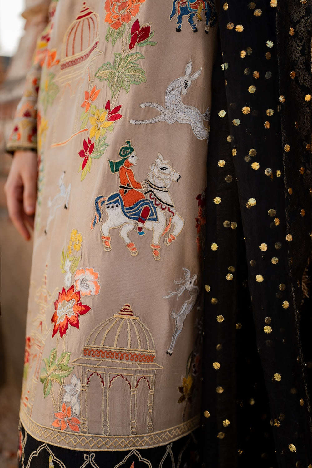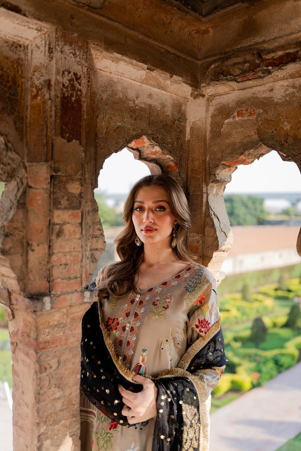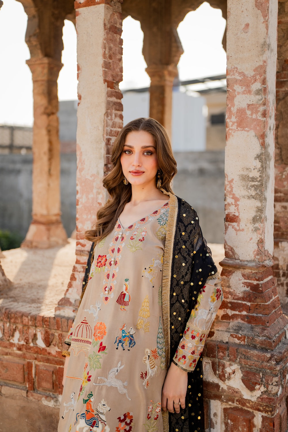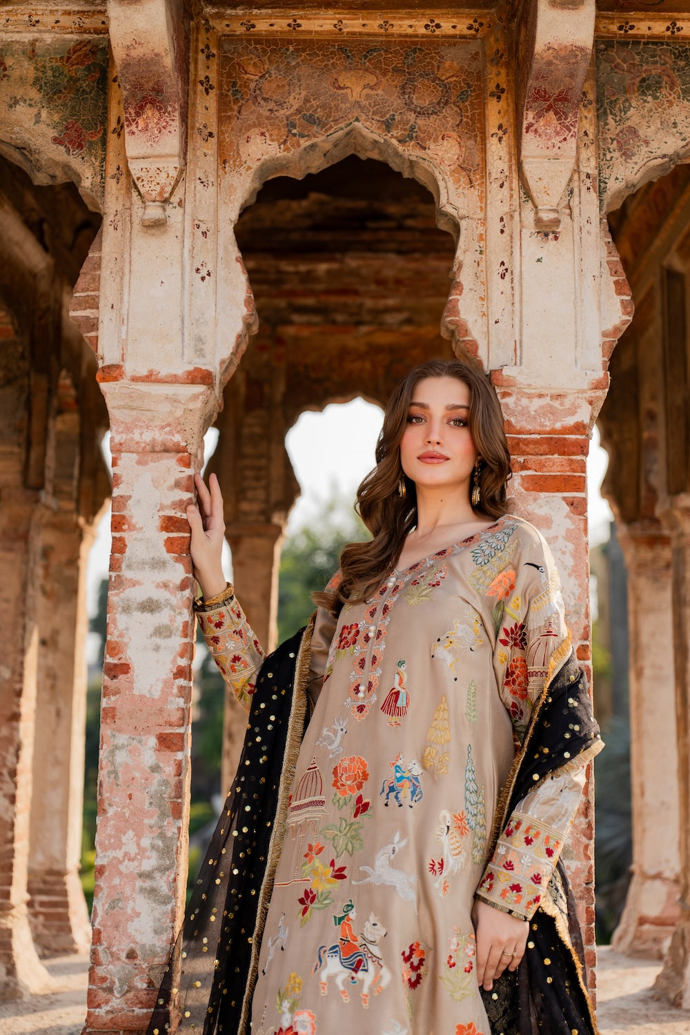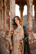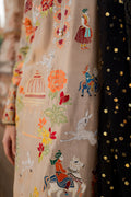 Malika is a masterpiece of embroidered storytelling—intricate birds and arches dance across the fabric, weaving a narrative of elegance. Every stitch deepens the allure, framed by striking black finishing that makes the design pop. Paired with a luxurious mukesh chann dupatta, it’s tailored for unforgettable soirees.