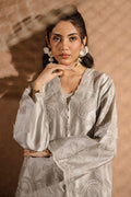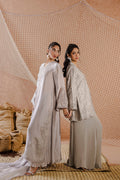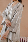 A loose-fit steel grey sheesha silk jacket with tonal embroidery and khaddi silk appliqué for subtle textural contrast. The set is paired with crepe palazzo pants, completing a fluid and modern silhouette.