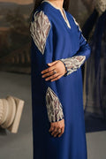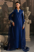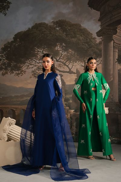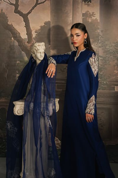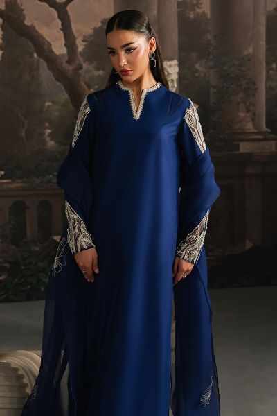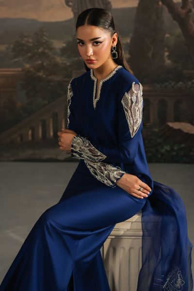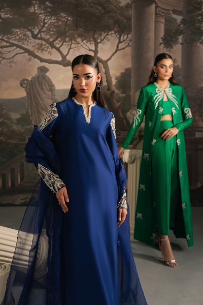 In tune with exclusive trends, Marcella is a long raw silk shirt, artfully adorned with delicate pearl and crystal embellishments. Its modernly Embellished And tailored sleeves set against a rich navy blue canvas create an effortless statement of elegance. Paired with straight pants and an organza dupatta edged with subtle finishing, this ensemble comes together as a complete vision of sophistication, a timeless choice for you.