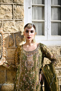 An elegant blend of olive green and bronze gold tones, this straight-cut shirt is richly adorned with intricate zardozi, dabka, gota, sequins, cutdana, and resham work. The embellishment dances across the neckline, sleeves, and hemline in traditional floral and paisley motifs, offering a regal yet refined aesthetic. Paired with a hand-embroidered izaar featuring complementing detailing along the cuffs, the ensemble is completed with a shimmering gold lama dupatta, edged with embellished borders that add texture and opulence.