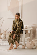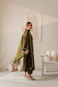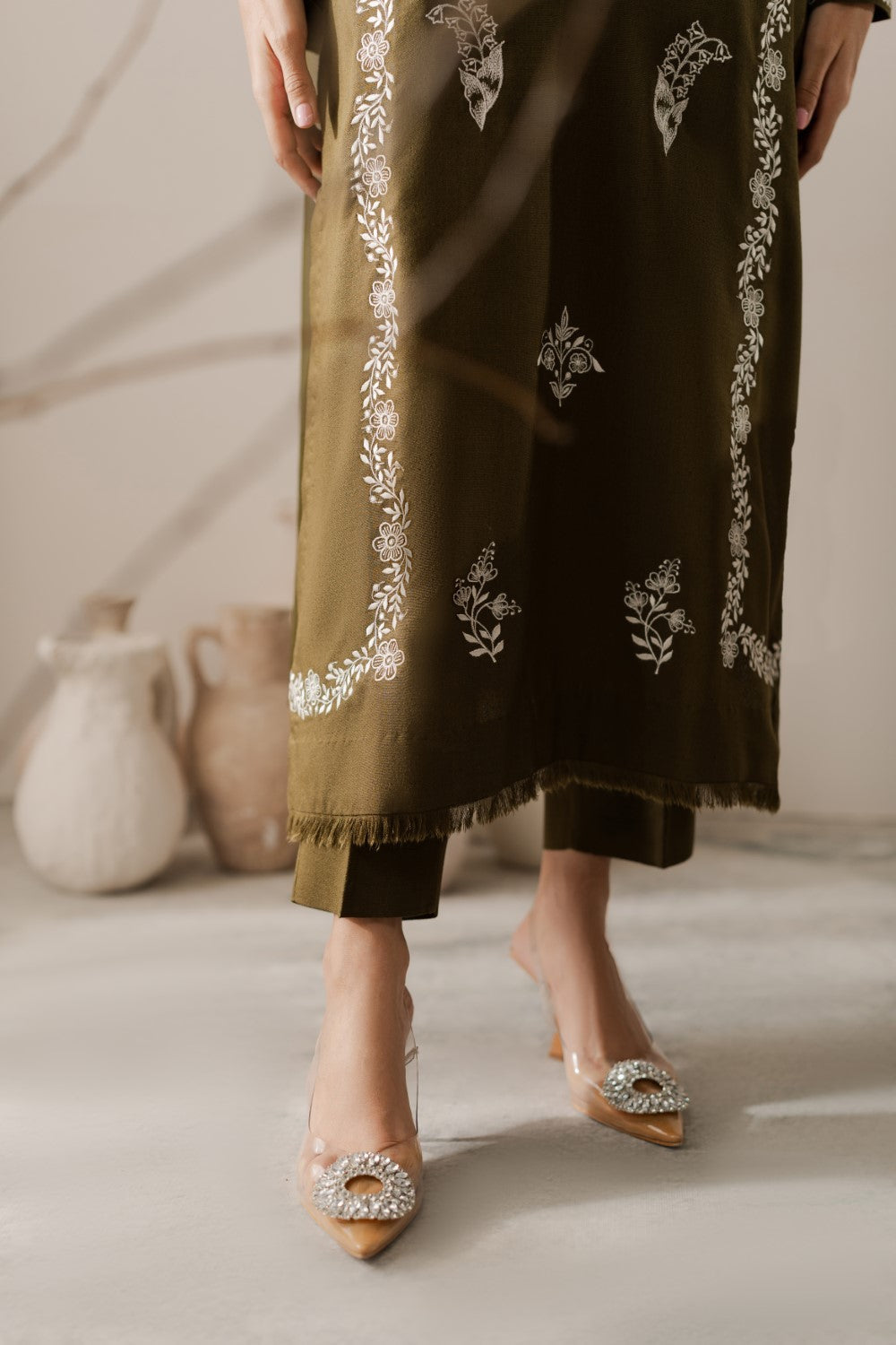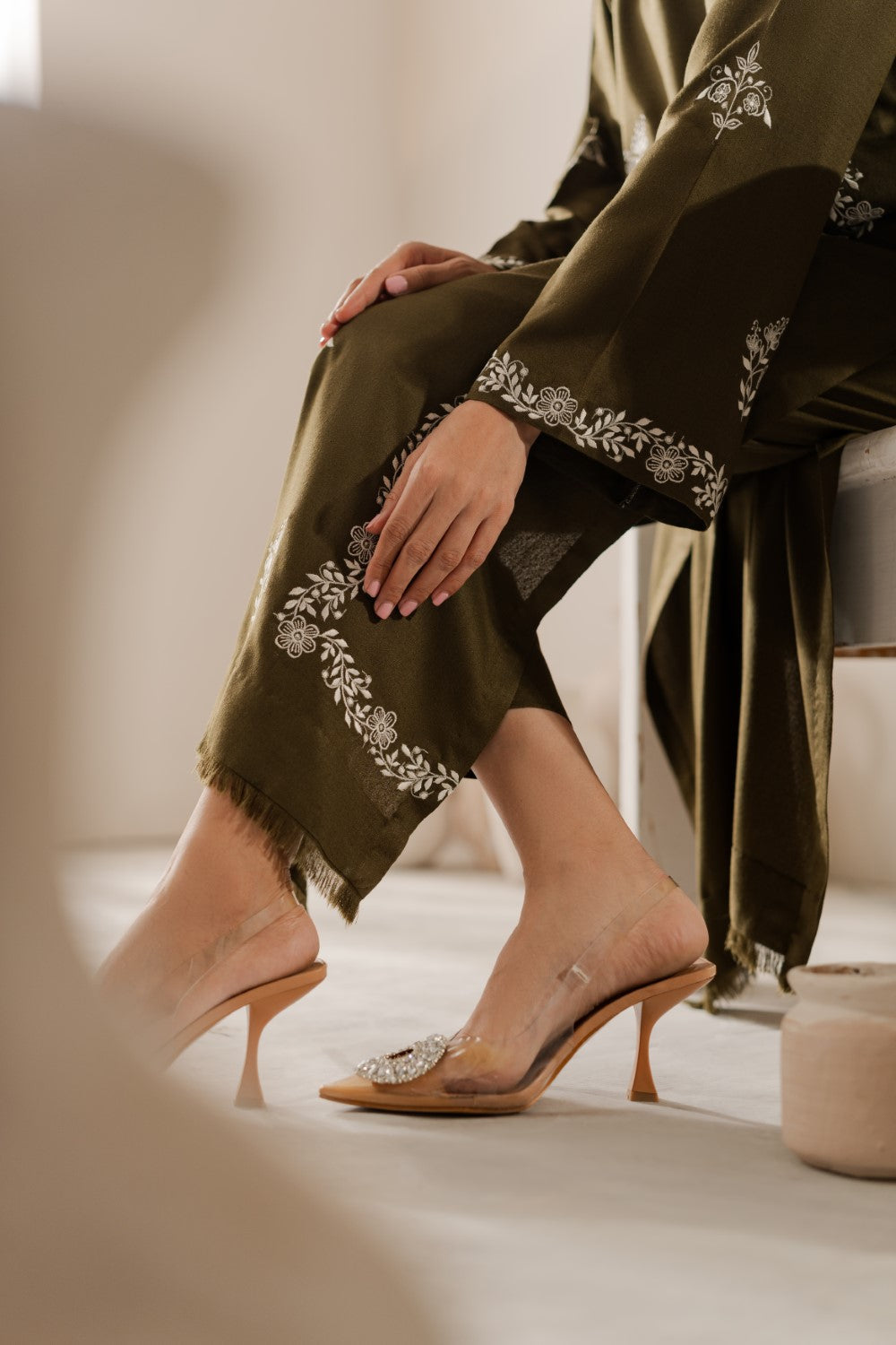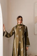 A striking green pure karandi ensemble stuns with embroidered details in contrasting hues of ivory. The matching pants and dupatta accentuate the beauty of the outfit and make it irresistible for this season.