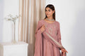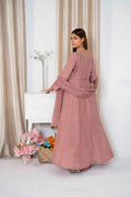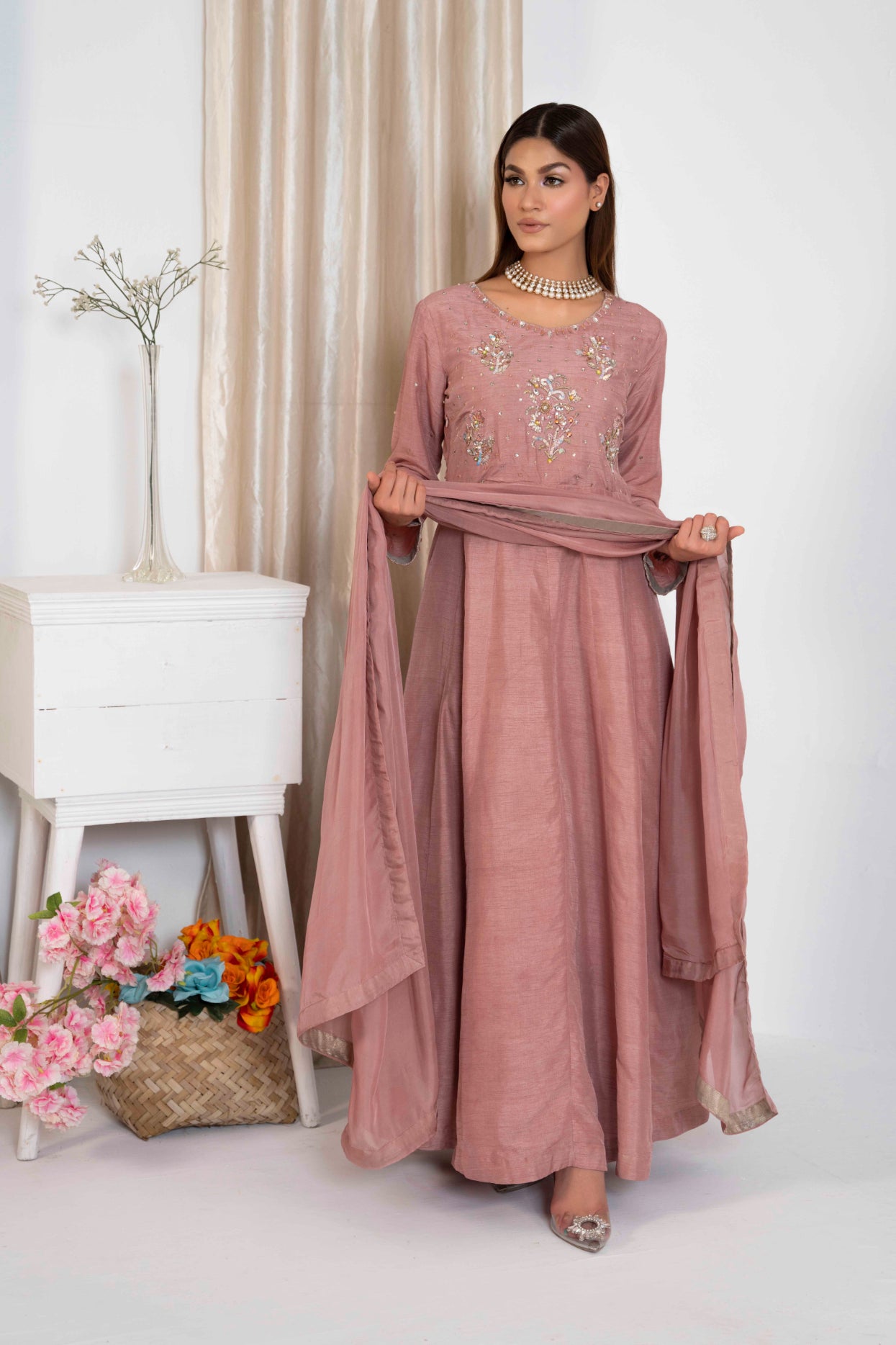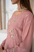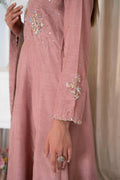 Step into a world of ethereal beauty with our blush pink frock ensemble! Crafted from exquisite Korean raw silk, the frock features delicate embroidery and hand embellishments that evoke a sense of enchantments. Paired with silk dupatta and trouser.
