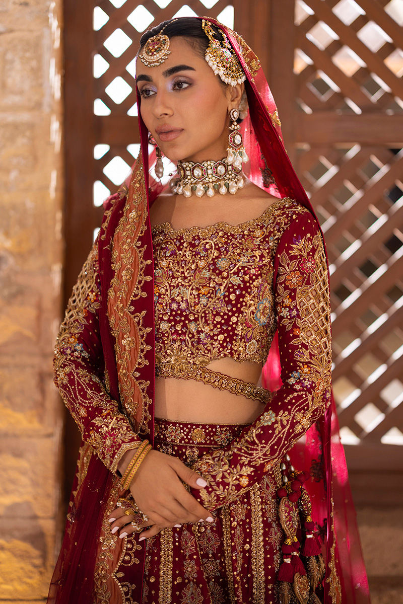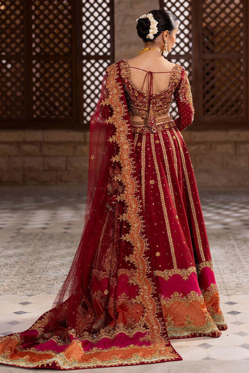 An opulent oxblood lehanga choli crafted from luxurious raw silk, this ensemble radiates timeless elegance. The choli features a delicate scalloped neckline, intricate resham work, and exquisite hand embellishments, with cutwork jaal and fitted sleeves accentuated by a refined belt detail. The back is finished with elegant dori accents, adding a touch of charm. The voluminous lehanga is adorned with vibrant appliqués in fuchsia, rust, and sage, enriched with resham embroidery and golden handwork, while the net dupatta is finished with appliqué details on the pallu, scalloped borders on all sides, and scattered floral botis with sequence detailing for a dreamy effect. Completing the look is an appliquéd and hand-embellished pouch, with craftsmanship featuring dabka, nakshi, cutdana, sitara, tikki stones, and zari — a true celebration of artistry and grandeur.