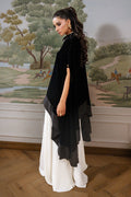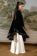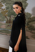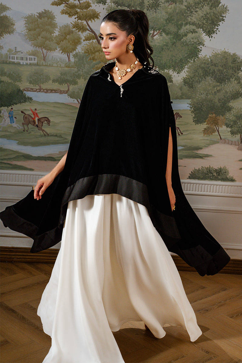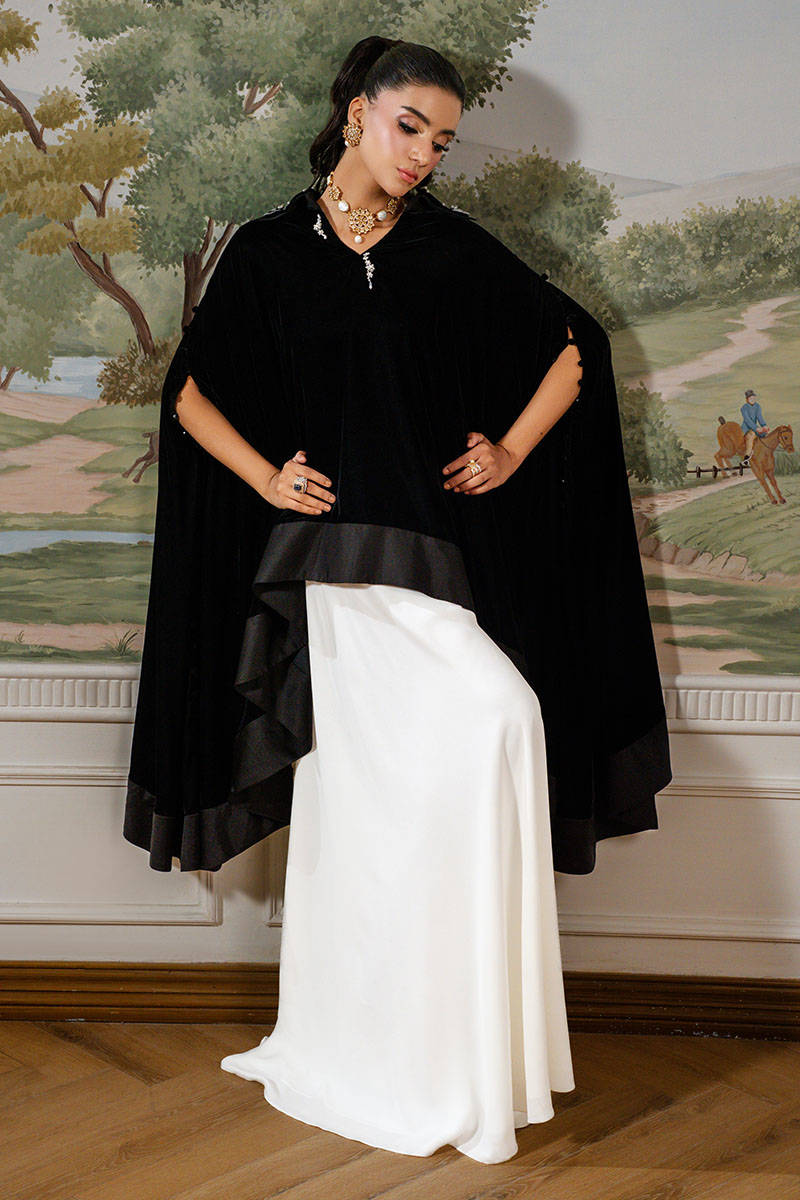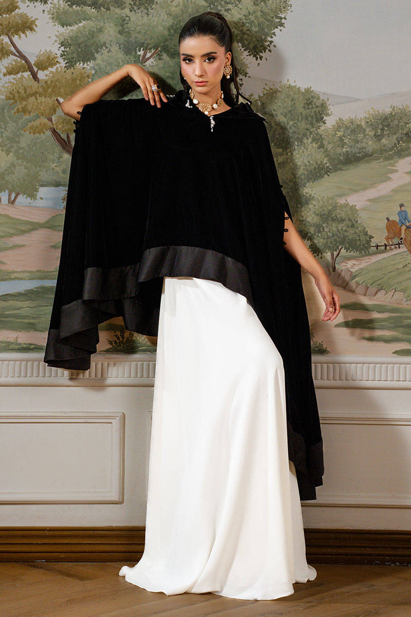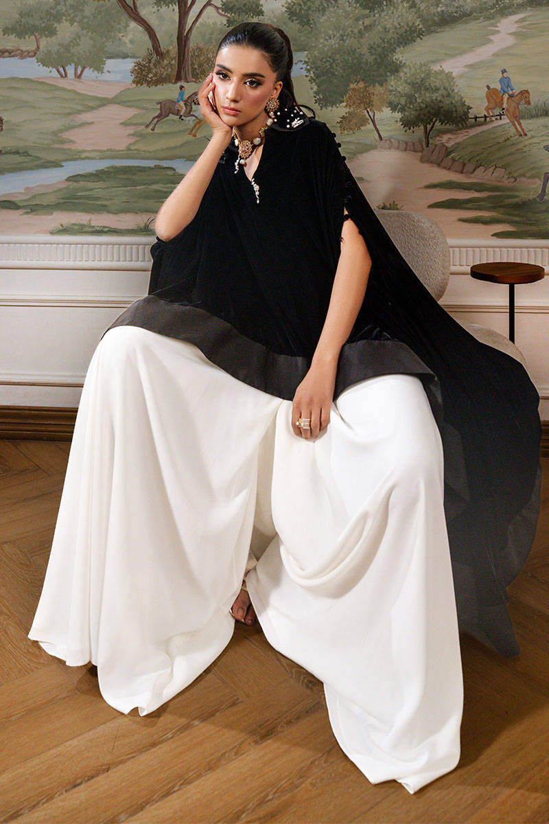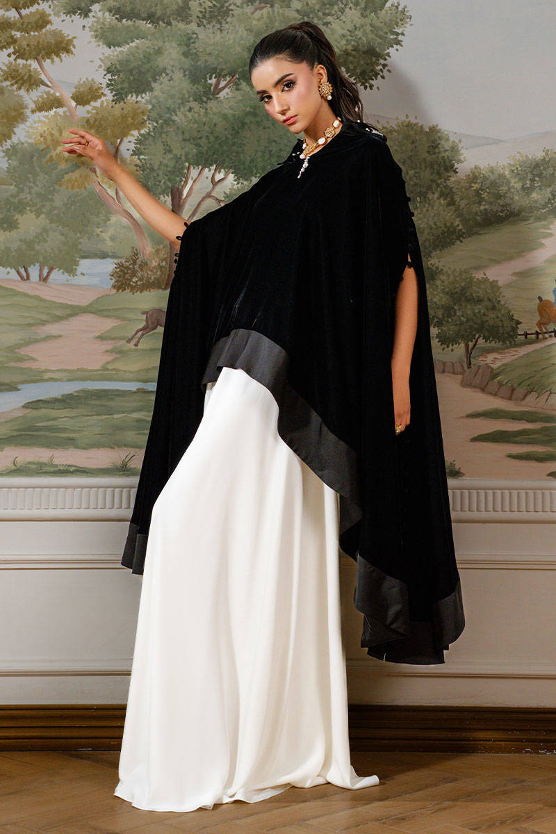 A statement black cape featuring intricate hand-embellished detailing along the collar and elegant loop-button accents running down the sleeves. Paired with Zainab Salman’s signature white Bambi pants, this look exudes effortless sophistication while maintaining a touch of modern drama.