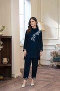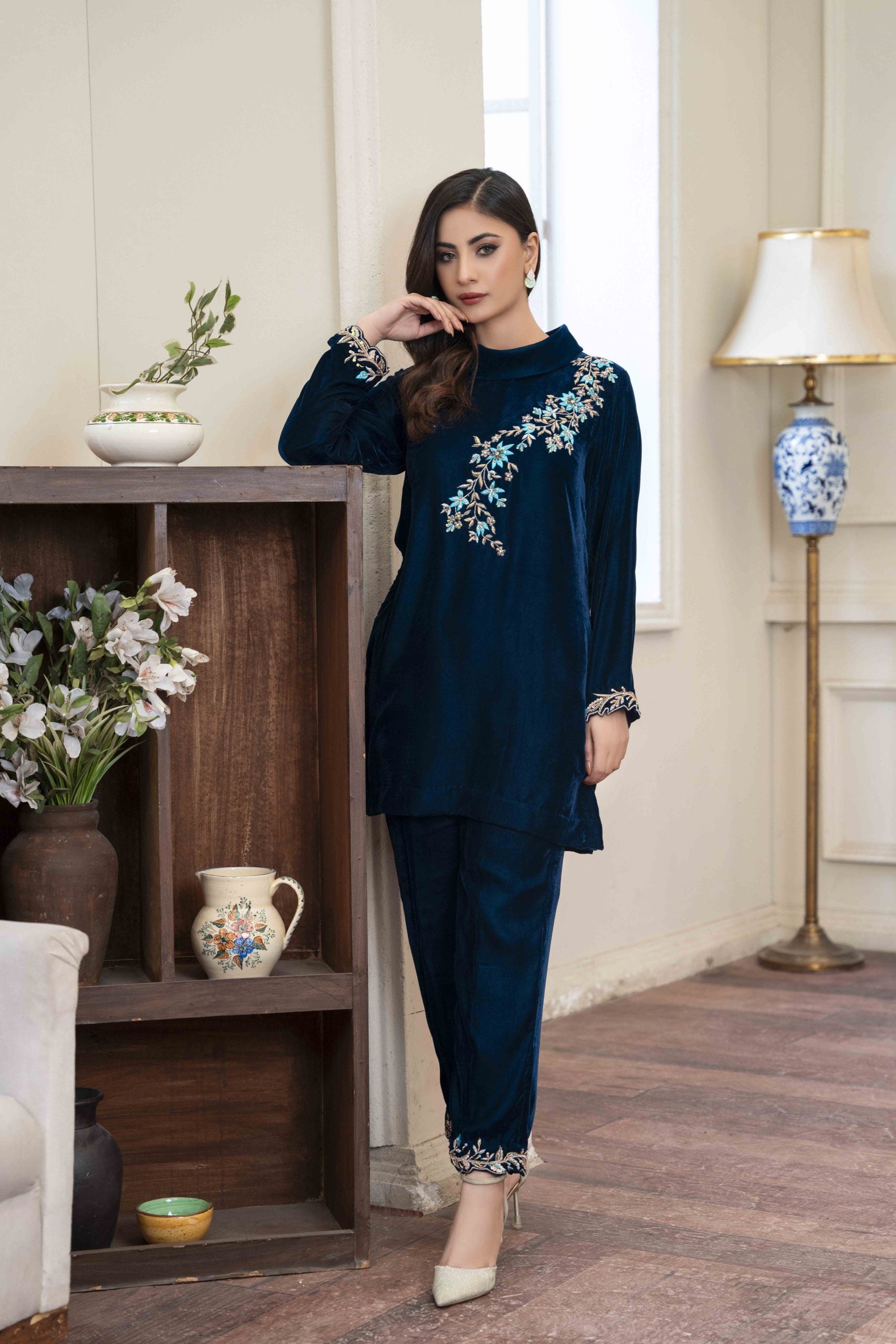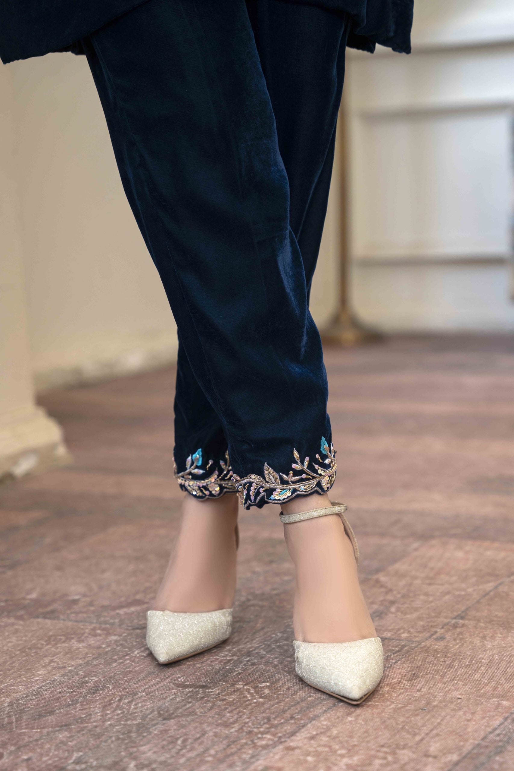 A teal colored velvet with a sharp silhouette, encrusted with Swarovski and sequins in floral patterns, embroidered with tilla work and cut work design on sleeves ad embroidered handwork on cigarette trousers.