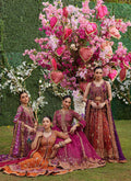A graceful fusion of warm tones and intricate embellishment, this burnt orange and berry ensemble is crafted for timeless elegance and regal charm. The front-open kalidaar is made from delicate net, featuring a striking jaal design on the bodice and sleeves, embellished with rich zardozi work using kora dabka, sequins, crystals, and resham in soft shades of pink and green. The kalis are adorned with zardozi and resham grapevine motifs, complemented by an all-over sequin spray that adds gentle sparkle. The hemline is finished with a block-printed charmeuse border, layered with a zari edge and further enhanced with detailed zardozi embroidery. Paired with a soft zari tissue lehnga in a complementing tone, the ensemble is completed with an intricately embellished zari border and subtle sequin spray throughout, adding graceful shimmer with every movement. The matching net dupatta ties the look together, featuring zari borders on all four sides and block-printed pallus, elevated with zardozi detailing and scattered sequins for a soft, luminous finish.