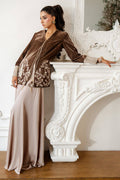 Misty Smoke is a sleek jacket in a stunning mouse-grey hue, featuring intricate embroidery and delicate tassel detailing. The contrasting accents on the sleeves add a touch of refinement, while the satin flared pants bring a contemporary fusion edge, making this ensemble effortlessly versatile and perfect for any occasion.