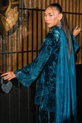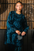 A refined teal short shirt adorned with delicate cutwork schiffli, enhanced by organza appliqué and intricate cut-dana and sequin detailing along the neckline and sleeve hems. Paired with a narrow shalwar featuring a beautifully scalloped border and organza appliqué, this ensemble blends elegance with artisanal craftsmanship—perfect for festive wear.