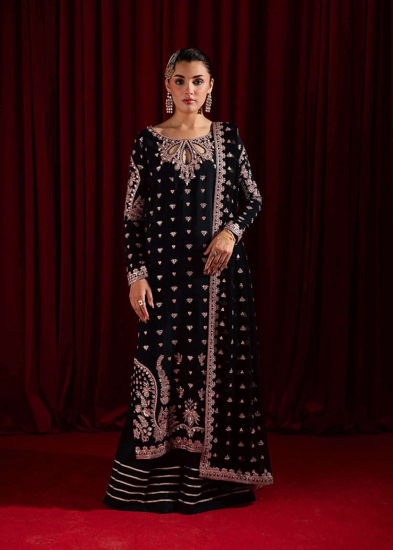 Prepare to be dazzled by our stunning Black Long Shirt, a masterpiece that combines timeless and detailed craftsmanship. The front is heavily embroidered and hand embelliseh with sequins, pearls, tilla and stones paired with a sharara - hand sewed gota finishing around the hem. A flowy chiffon dupatta full of bling makes sure whether you're attending a high-profile event or a special celebration, this outfit guarantees all eyes will be on you. Truly a showstopper this is elegance redefined