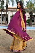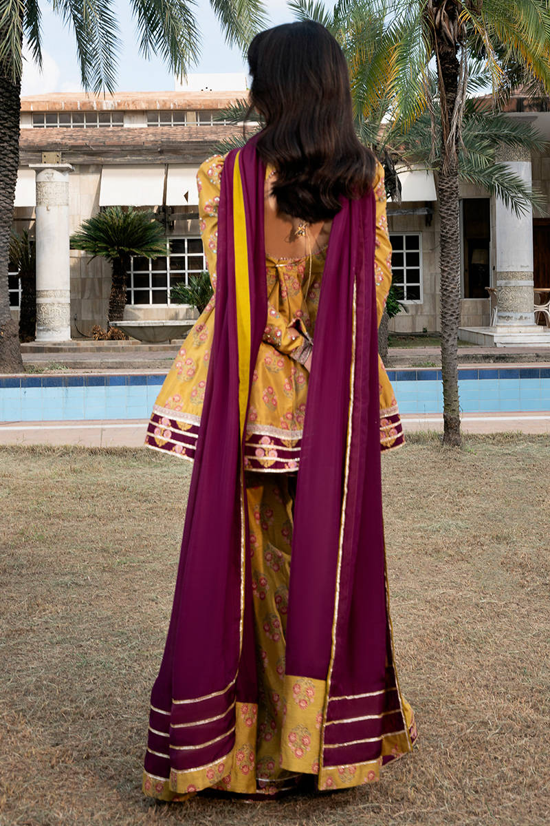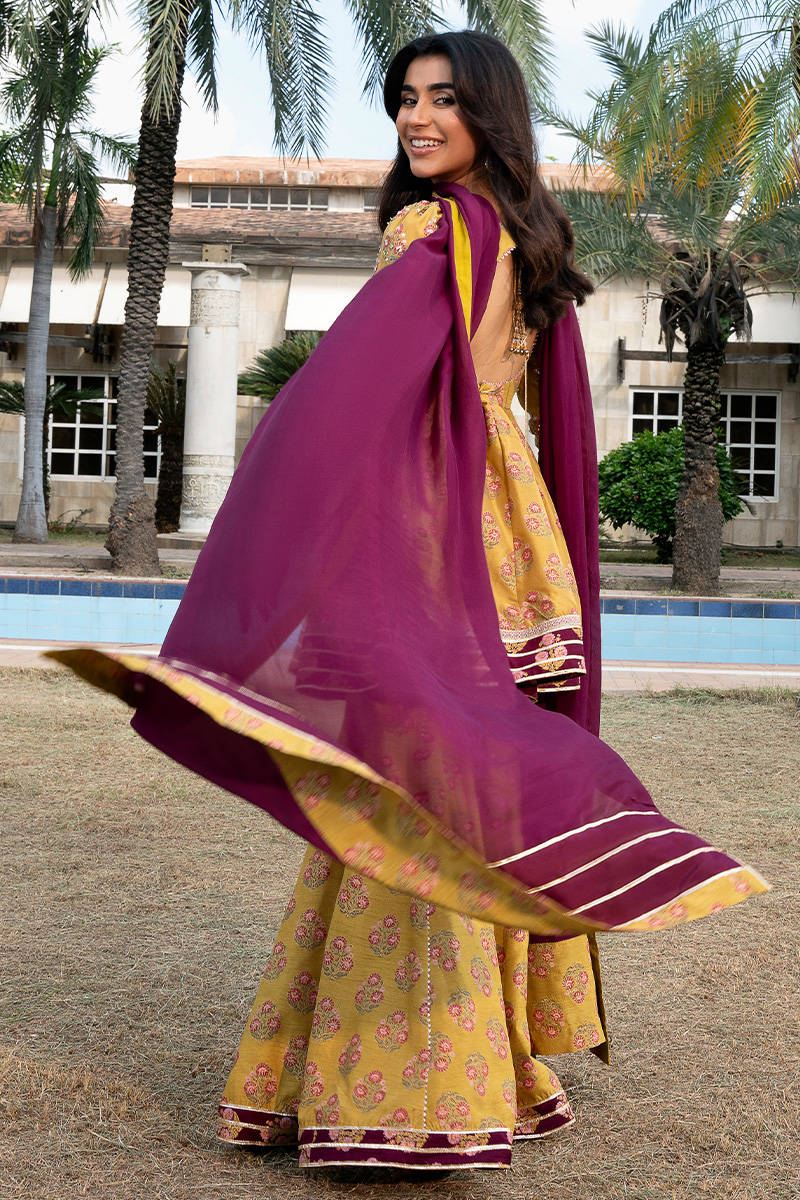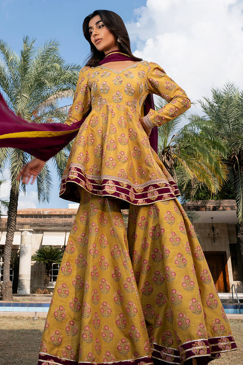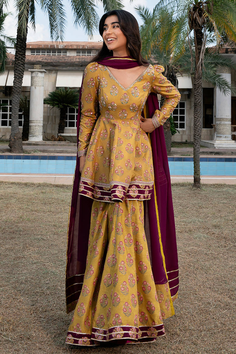 Mustard Muse is a striking screen-printed raw silk peplum, featuring intricate hand embellishments on the bodice and refined stitching details in a contrasting hue along the hem for added definition. Full-length fitted puff sleeves complete the silhouette, making it an ideal choice for the upcoming festive season. It is paired with matching printed gharara pants, enhanced with contrasting finishes to elevate the overall look. The ensemble is beautifully tied together with a rich plum silk dupatta, adorned with printed borders—making this a truly timeless piece.