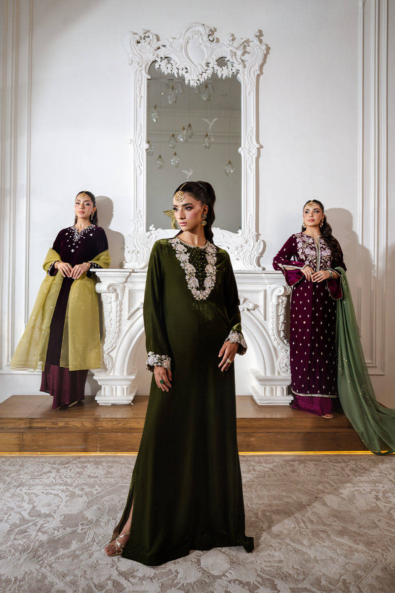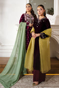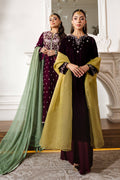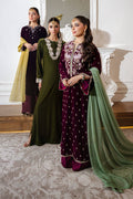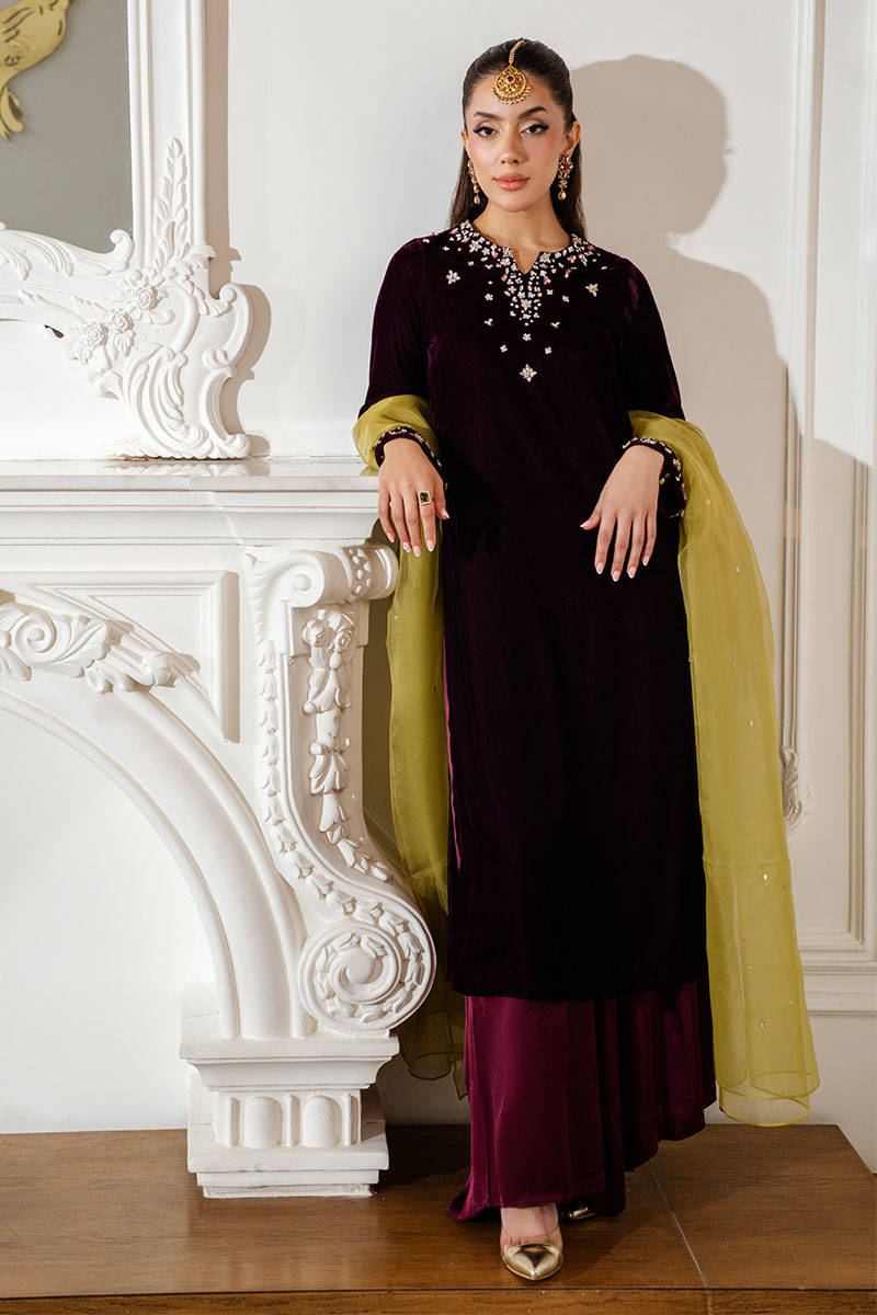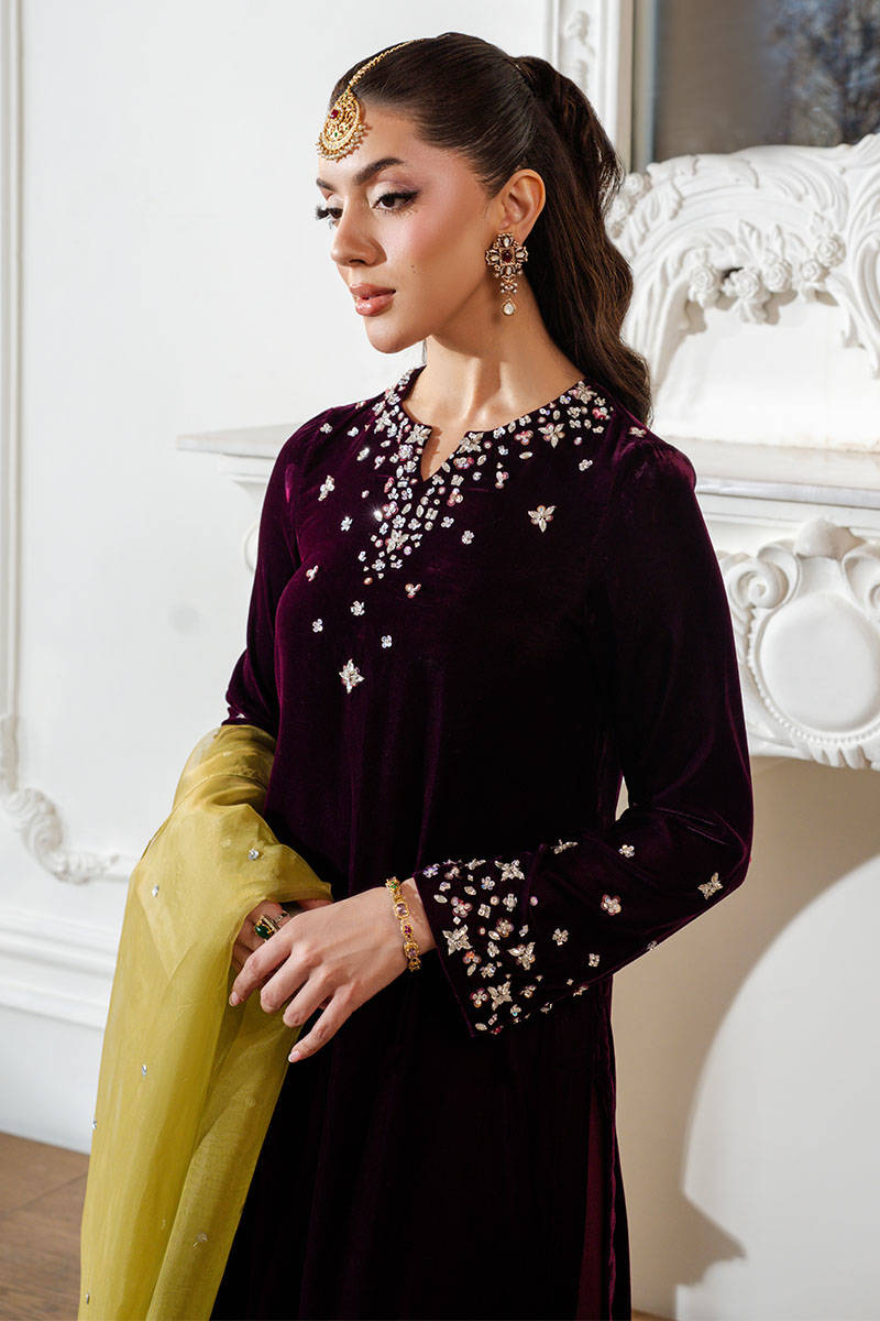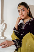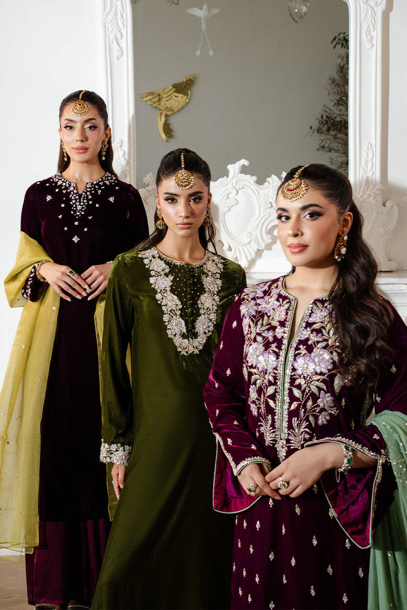 Muted Rose is an exquisitely crafted plum velvet shirt featuring a delicately hand-embellished neckline adorned with colored sequins. The refined craftsmanship extends to the sleeves, adding just the right touch of festive allure. Paired with matching satin pants and a contrasting olive green organza dupatta with a delicate sequin spray, this ensemble strikes the perfect balance between elegance and celebration, ideal for the upcoming festive season.