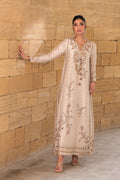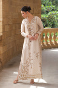 An opulent kaftan in moonlit ivory cotton net, lavishly adorned with zardoze, sequins, and delicate floral sprigs, is punctuated with maroon 3D tassels for a touch of contrast. Accents of kamdani along the sides, a gold self embossed print, and a densely embellished cutwork hemline come together in a poetic ode to heritage.