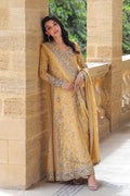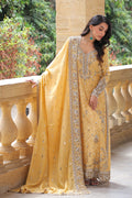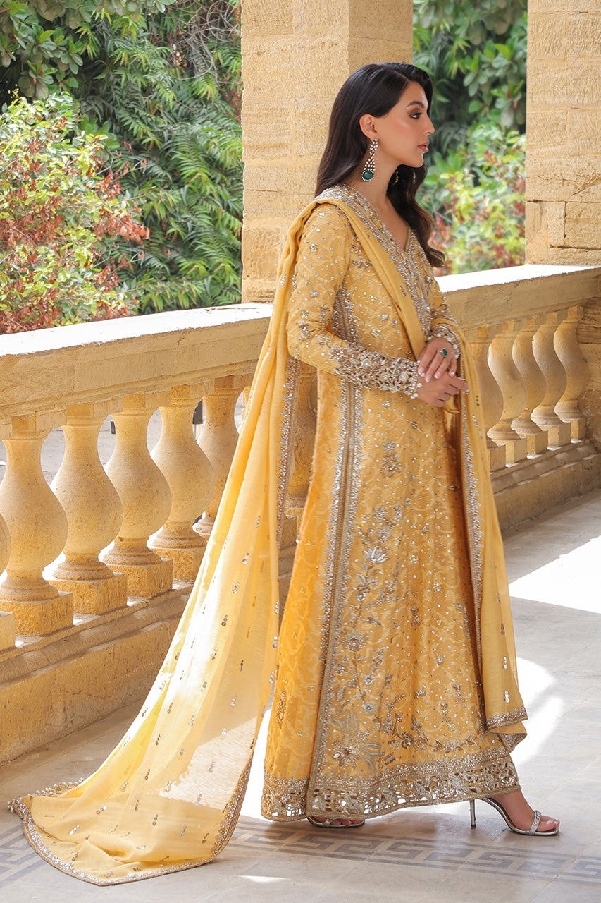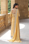 A flowing A-line column shirt in luminous saffron self-embossed cotton net, drenched in silver zardoze, gota, resham, and sequins, channels heirloom romance with modern poise. Scalloped borders richly frame the sleeves and hemline, adding textural depth. Paired with a tonal cotton net dupatta, its ornate embroidered frame and scattered sequins catch the light, while embroidered pure rawsilk izaar in the same sunlit hue ground the look in timeless elegance.