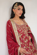 A regal long shirt in deep scarlet cotton net is lavishly embellished with antique zardoze, resham florals, and delicate bird motifs, weaving a tapestry of artisanal elegance. The flowing cotton net dupatta shimmers with intricate kamdani and is framed with a contrasting applique border enriched with zardoze embroidery. Paired with pure rawsilk izaar for a refined finish, the ensemble stands as a timeless expression of bridal romance and couture craftsmanship.