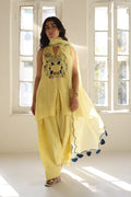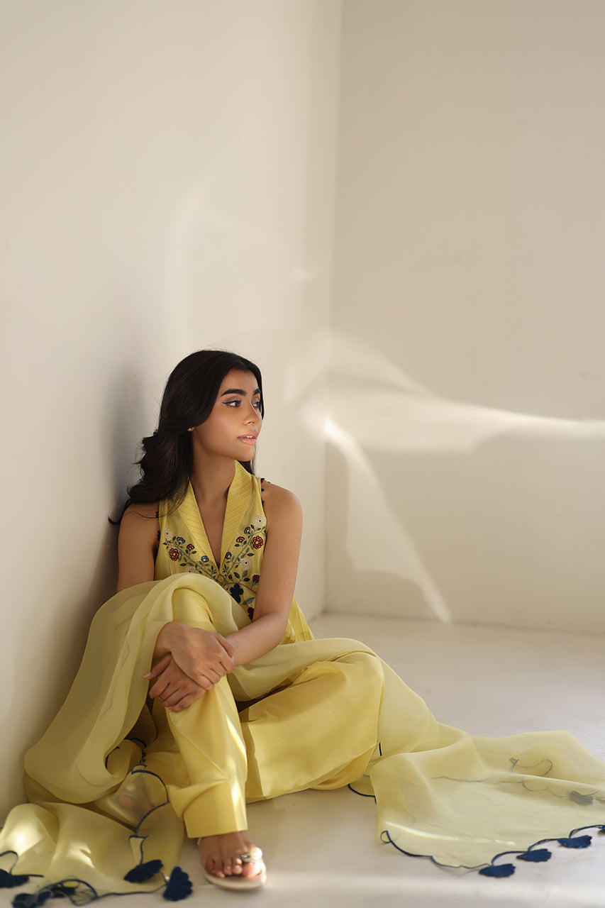 A lemon hued ensemble redefines elegance with its flattering silhouette. The pure rawsilk sleeveless shirt features delicate pleats and intricate floral embroidery, evoking artisanal charm, while a bold front slit adds a contemporary edge. Paired with a voluminous pure rawsilk farshi shalwar for effortless movement, the look is completed with an organza dupatta, adorned with scalloped edges and appliqué florals in deep sapphire tones.