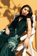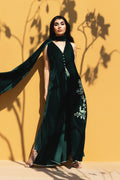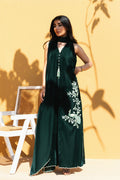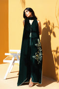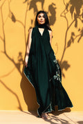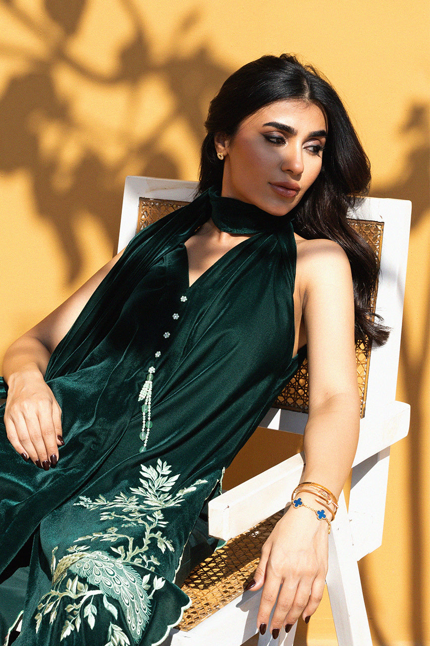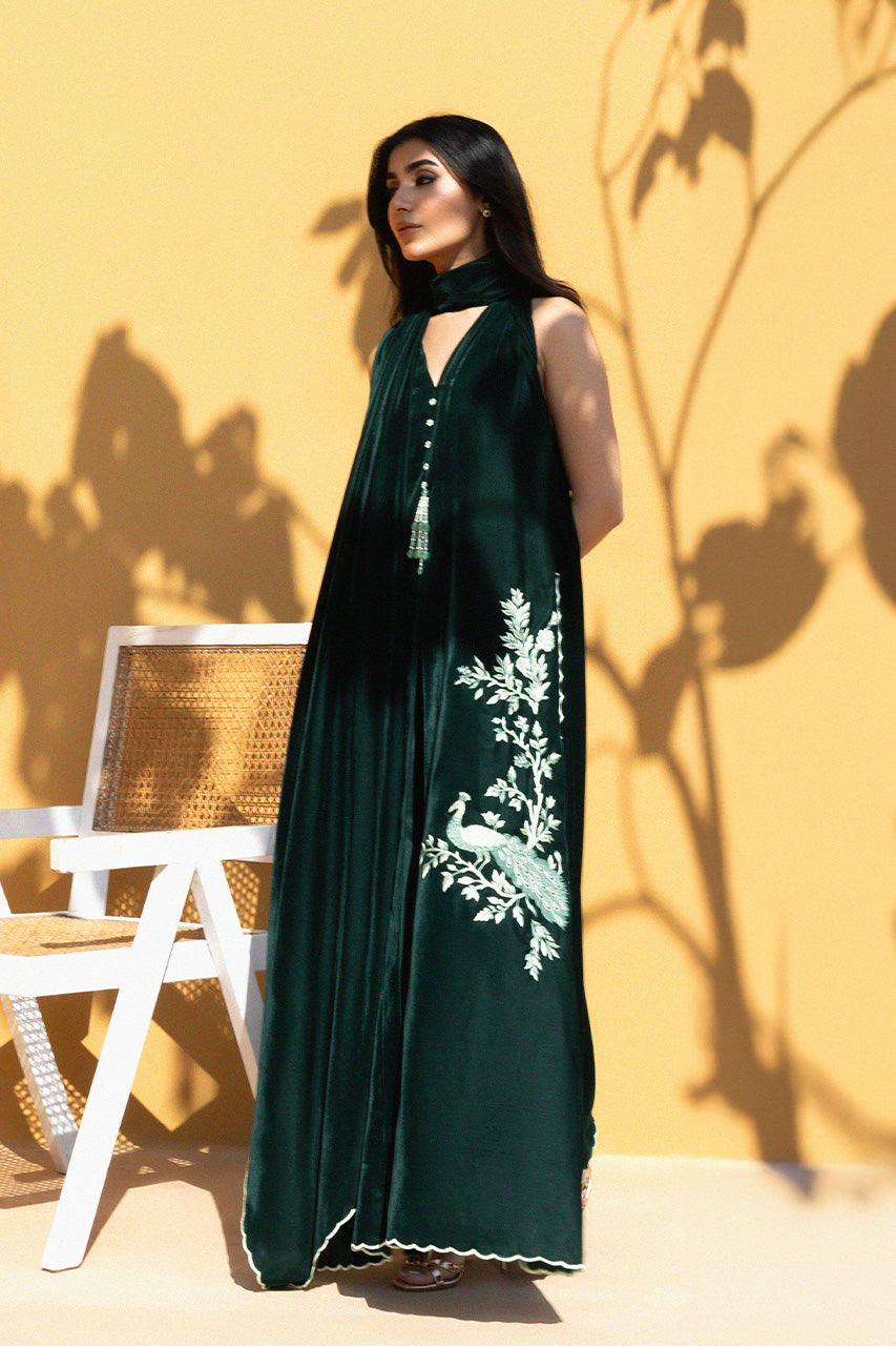 An emerald velvet silhouette combines fluid drama with refined detailing. An integrated stole drapes around the neckline and cascades along the length, creating a soft, cape-like sweep that contrasts the structured cut. The V-neckline is embellished with buttons and a tassel, adding a touch of subtle movement. A resham embroidered peacock perched on tonal foliage brings a poetic accent to the deep-hued velvet. Scalloped edges along the drape and hem complete the look, paired with matching pure raw silk trousers.