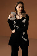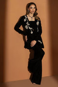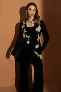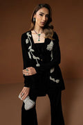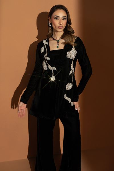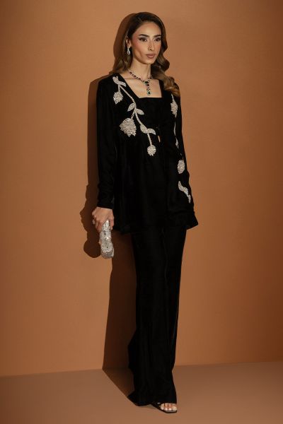 A jet-black velvet short jacket is adorned with gleaming silver floral embroidery, creating a radiant dance of light and texture. Paired with graceful boot-cut pants, Ophira strikes a perfect harmony between modern and classy elegance.