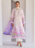 This ensemble features a soft lavender raw silk shirt, brought to life with delicate floral prints in hues of pink, lavender, and green—a fresh, botanical dream. The relaxed, universally flattering silhouette is enhanced by a graceful neckline, adorned with hand-crafted floral motifs made of pearls and sequins for just the right hint of sparkle.