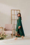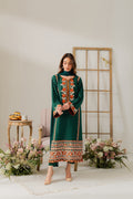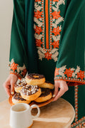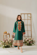 This stunning emerald green two-piece outfit is adorned with delicate hand aari embroidery in bold, vibrant colors, creating a striking contrast. The intricate craftsmanship adds elegance and charm, making it perfect for all your occasions. A matching dupatta is available separately to complete the look.