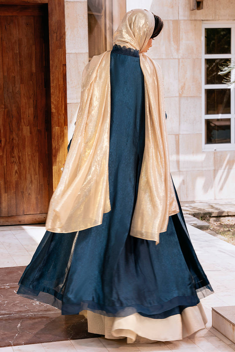 Pleated Charm is a statement ensemble crafted from luxurious self-textured tissue silk. The jacket features delicately embellished motifs and sleek, fitted sleeves adorned with gold button detailing for a refined finish. Underneath, a flowy inner adds graceful movement, accentuated with golden tissue finishing along the hem. Complete the look with a contrasting gold lame scarf, adding just the right touch of elegance and drama—perfect for festive and formal occasions.