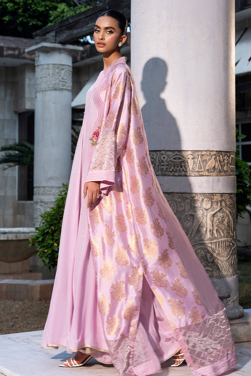 An eye-catching powder pink long jacket, crafted from pure jamawar, featuring intricate floral motifs that exude timeless elegance. The look is elevated with a beautifully detailed inner, accented with delicate buttons that lend a refined Middle Eastern aesthetic. Paired with a dual-toned, contrasting scarf, this ensemble is effortlessly graceful—making it the perfect choice for occasions.