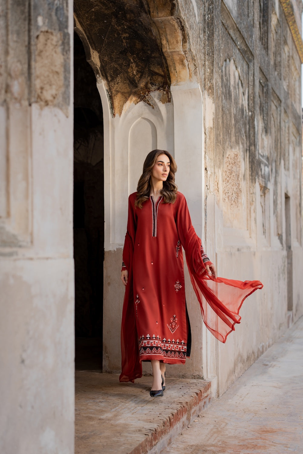 This burnt orange bliss features effortless grace in every stitch. The intricate embroidered motifs grace the shirt front, while the hem and delicate organza patch, add that seasonal sparkle. Perfect for turning heads and staying chic all night.
