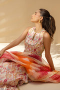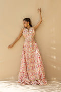 In a muted blush ivory hue with hints of rosewater, powder blue and soft coral this sleeveless, front open peshwas is cut from a featherlight khaddi silk that moves with ease. The flowing silhouette features a delicate print elevated with gota details and an embroidered bodice with subtle keyhole neckline. A multi hued organza dupatta with gota borders lends to the romanticism of the ensemble. Paired with matching cascading flared pants cut from khaddi silk, complementing the front open silhouette effortlessly.