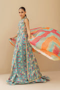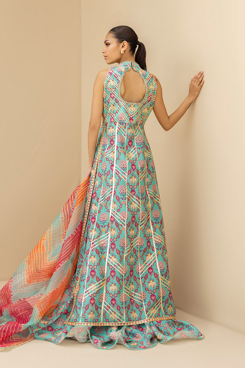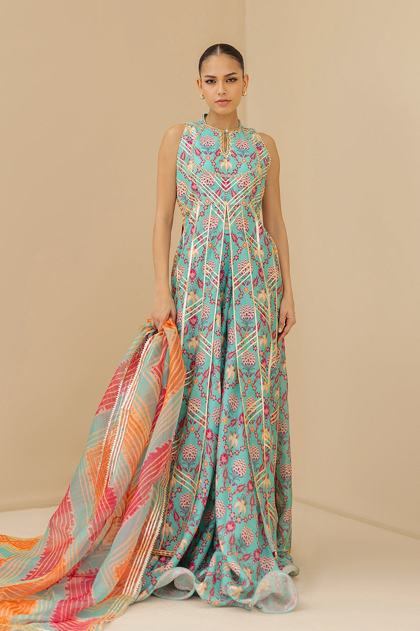 In a deep powder blue hue with hints of blush, lavender and hot pink this sleeveless, front open peshwas is cut from a featherlight khaddi silk that moves with ease. The flowing silhouette features a delicate print elevated with gota details and an embroidered bodice with subtle keyhole neckline. A multi hued organza dupatta with gota borders lends to the romanticism of the ensemble. Paired with matching cascading flared pants cut from khaddi silk, complementing the front open silhouette effortlessly.