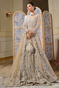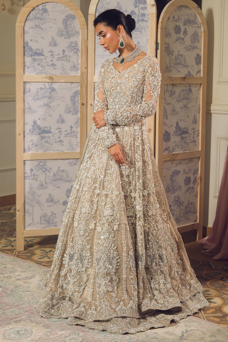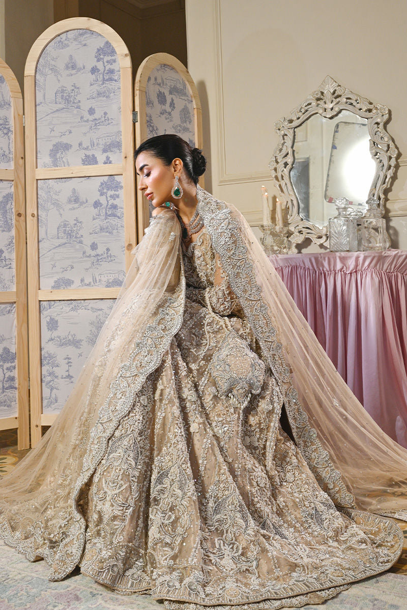 A nude-toned reception bridal featuring a net kalidar with a delicate cutwork neckline, paired with a shimmering lame lehenga and a soft net dupatta. The ensemble is exquisitely adorned with cutdana, Swarovski stones, sequins, dabka, and pearls, creating a refined balance of sparkle and elegance—perfect for a graceful reception look.