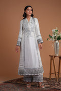 The ensemble is an elegant silver-toned traditional outfit featuring a long, structured kameez with intricate floral and geometric embroidery, wide-legged trousers, and a beautifully detailed dupatta. The kameez boasts luxurious fabric with silver embroidery on the front, neckline, cuffs, and hemline, while the trousers are tailored with embroidered details at the hem. The sheer dupatta adds a shimmering touch with its silver stripes and pleated texture. This sophisticated combination of traditional and modern elements makes it an ideal choice for formal gatherings, weddings, or festive occasions.
