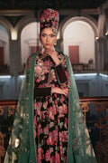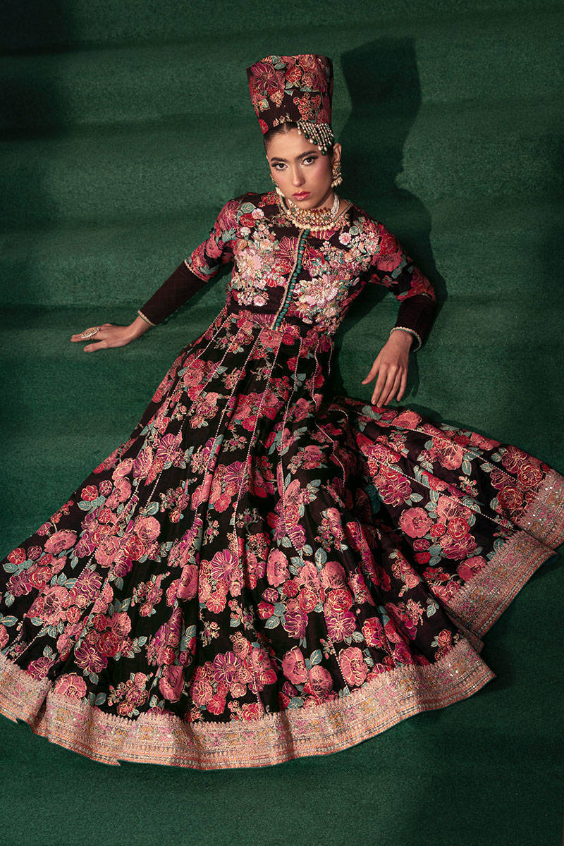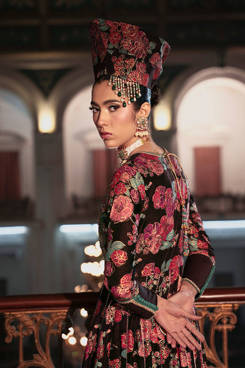 "Rosey Garden" is a breathtaking chocolate brown raw silk kalidar, adorned with delicate floral prints and intricate hand embellishments on the bodice. The stunning borders along the hem add an extra touch of elegance. The sophistication of the outfit is elevated by contrasting seagreen loop button details and beautifully fitted sleeves with finely stitched cuffs. This exquisite kalidar is paired with matching trousers and a contrasting net dupatta, embellished with a delicate sequin spray that completes the look with the perfect balance of grace and glamour. Timeless and refined, this ensemble is an ideal choice for any special occasion, exuding elegance in every detail.